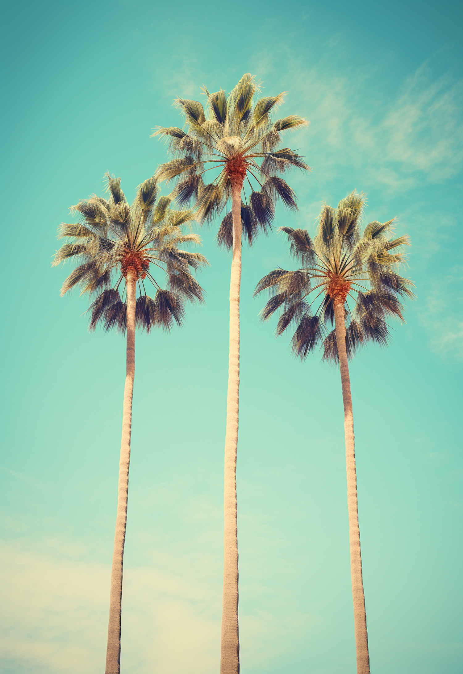 Three tall palm trees against a vibrant turquoise sky, creating a serene and tropical atmosphere.