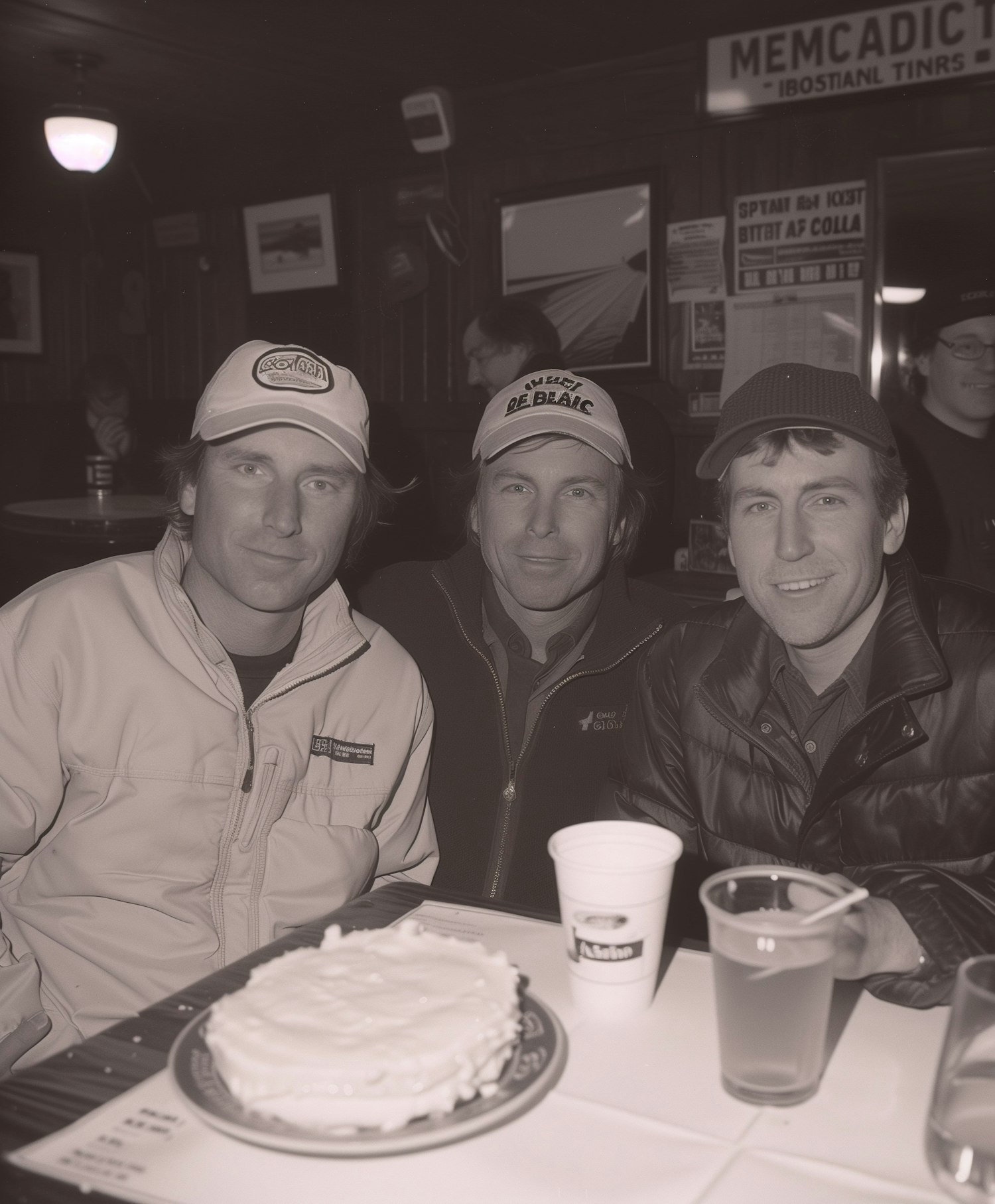 Three men in casual attire sit at a table with a cake and drinks in a cozy, rustic setting.