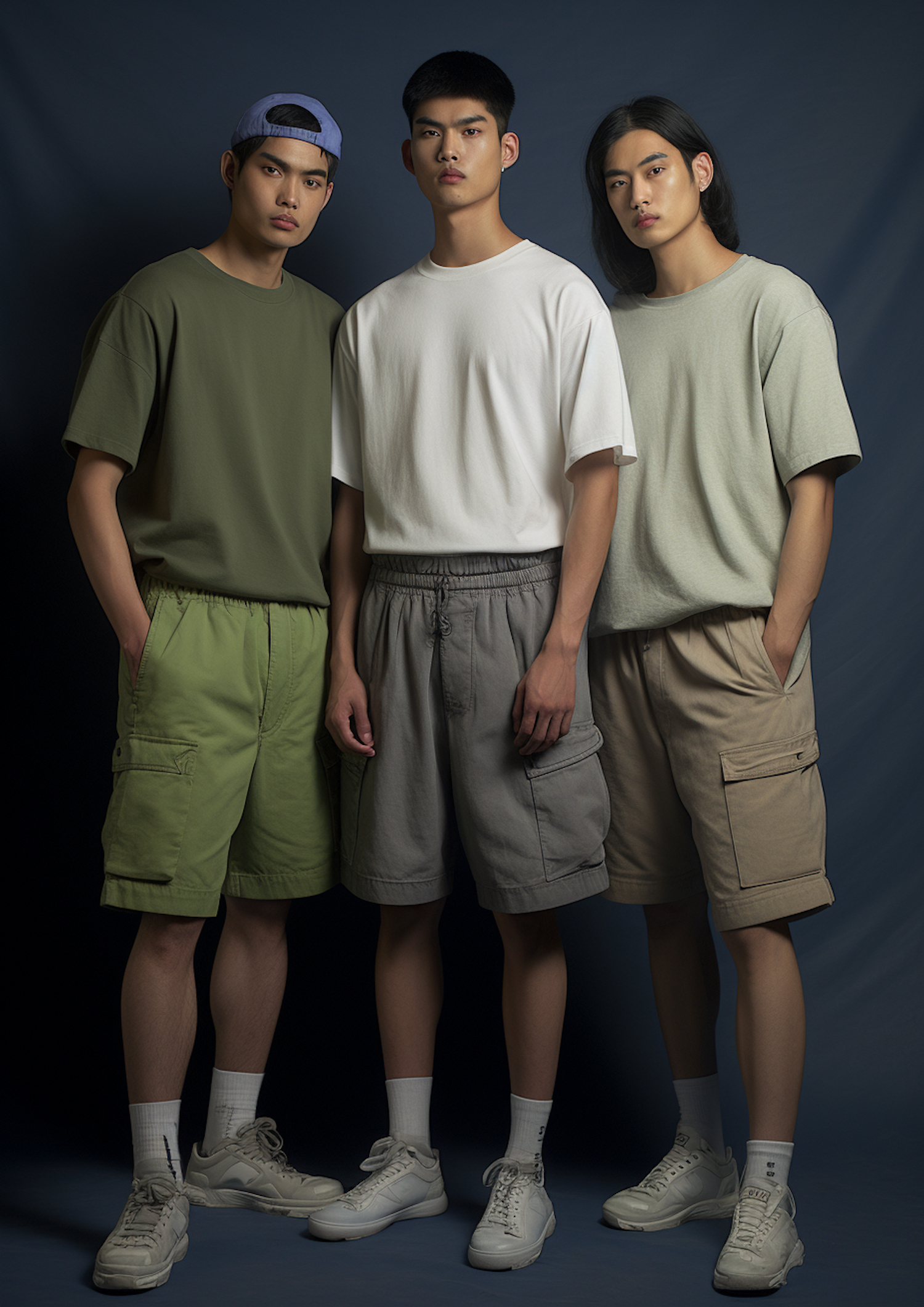 Three young men in casual outfits pose confidently, wearing t-shirts and cargo shorts. Their relaxed style and calm expressions stand out.