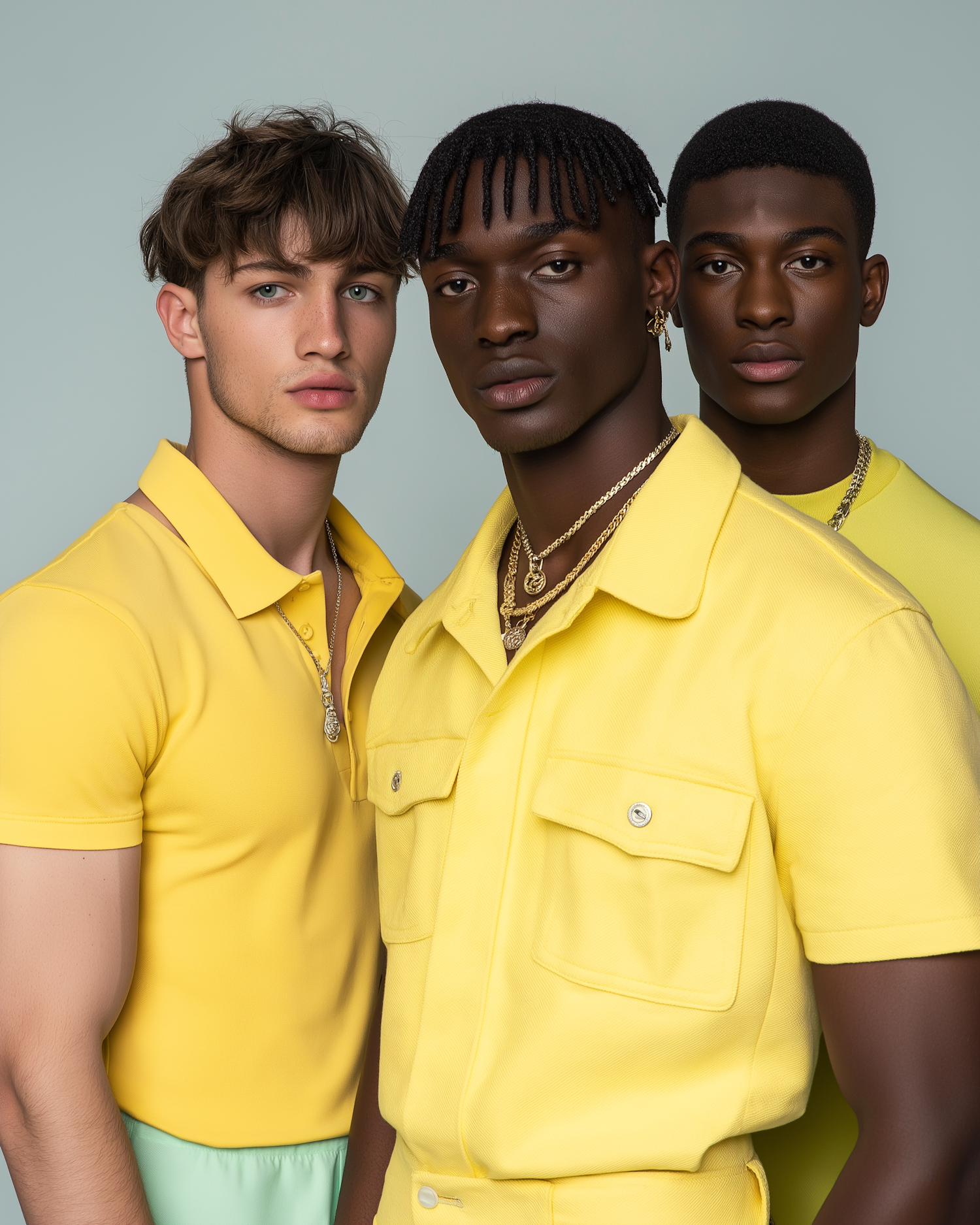 Three stylish young men in bright yellow outfits pose confidently against a muted green background.