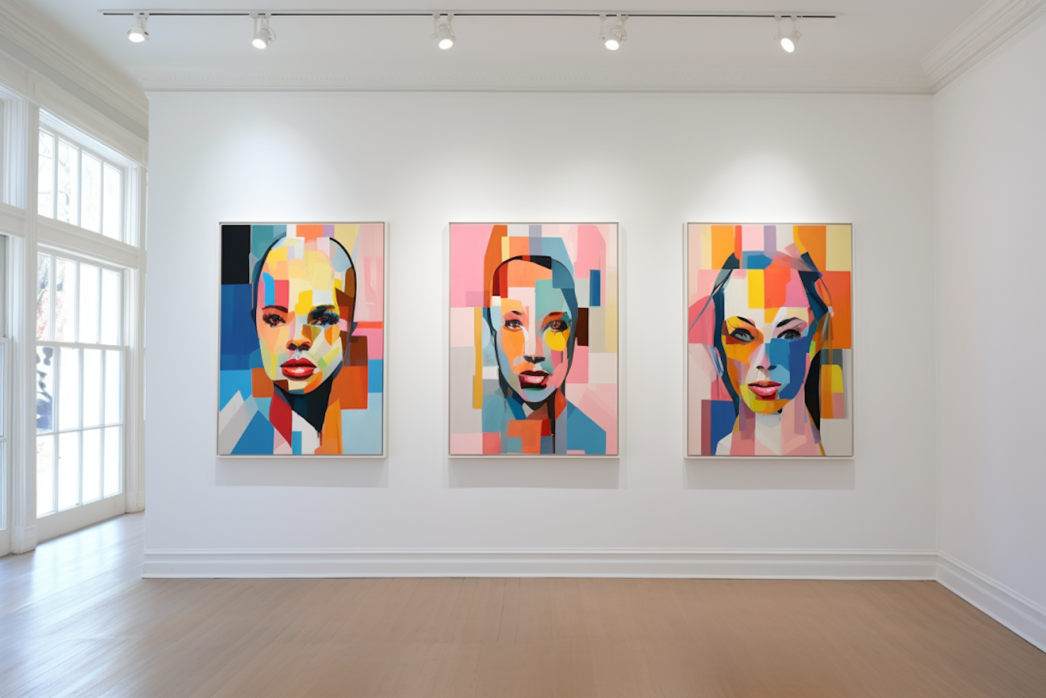 Three abstract portraits with bold colors and geometric shapes in a bright gallery setting.
