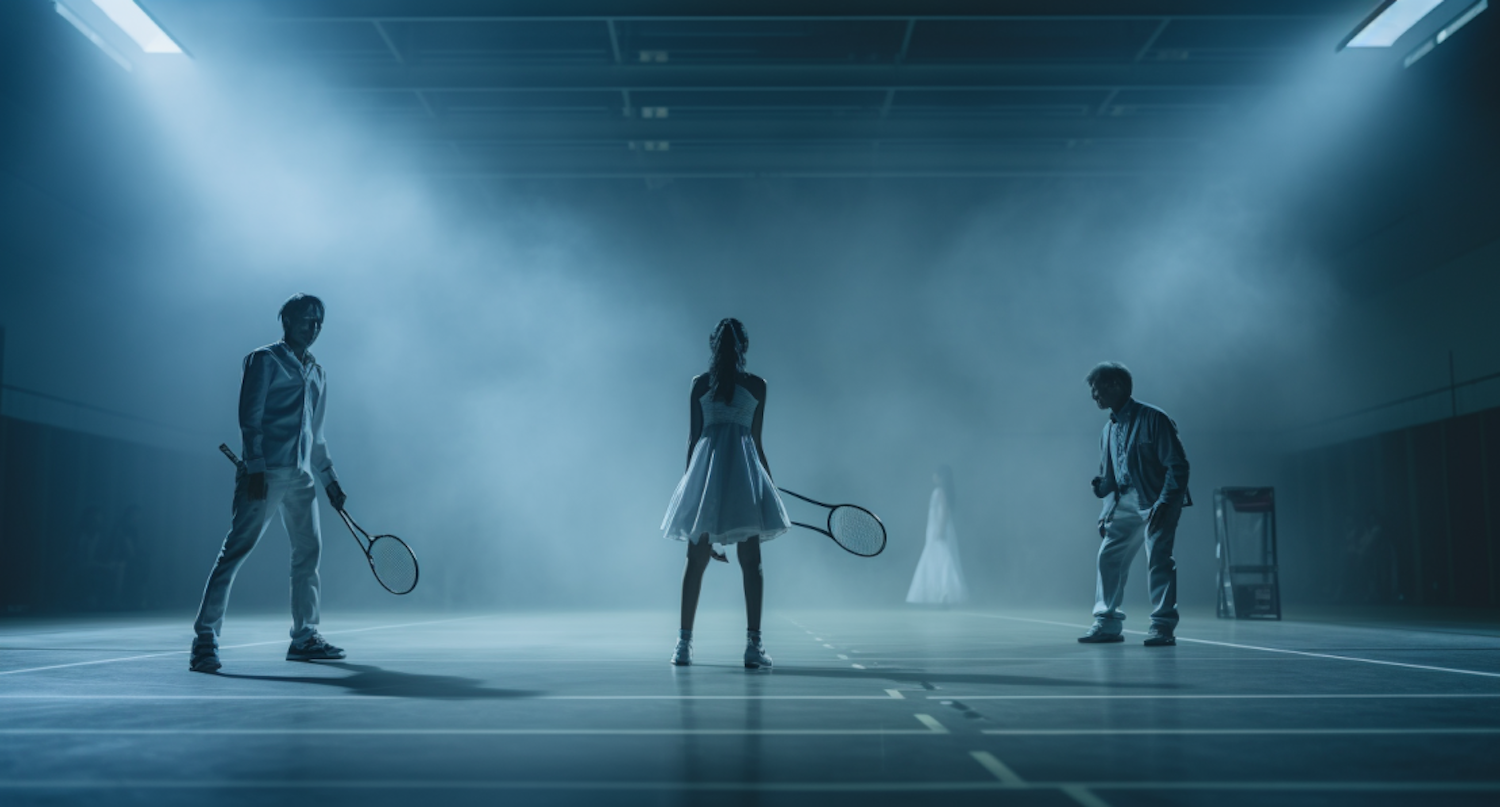 Dramatic scene on a misty indoor tennis court with three players poised for action under blue lighting.