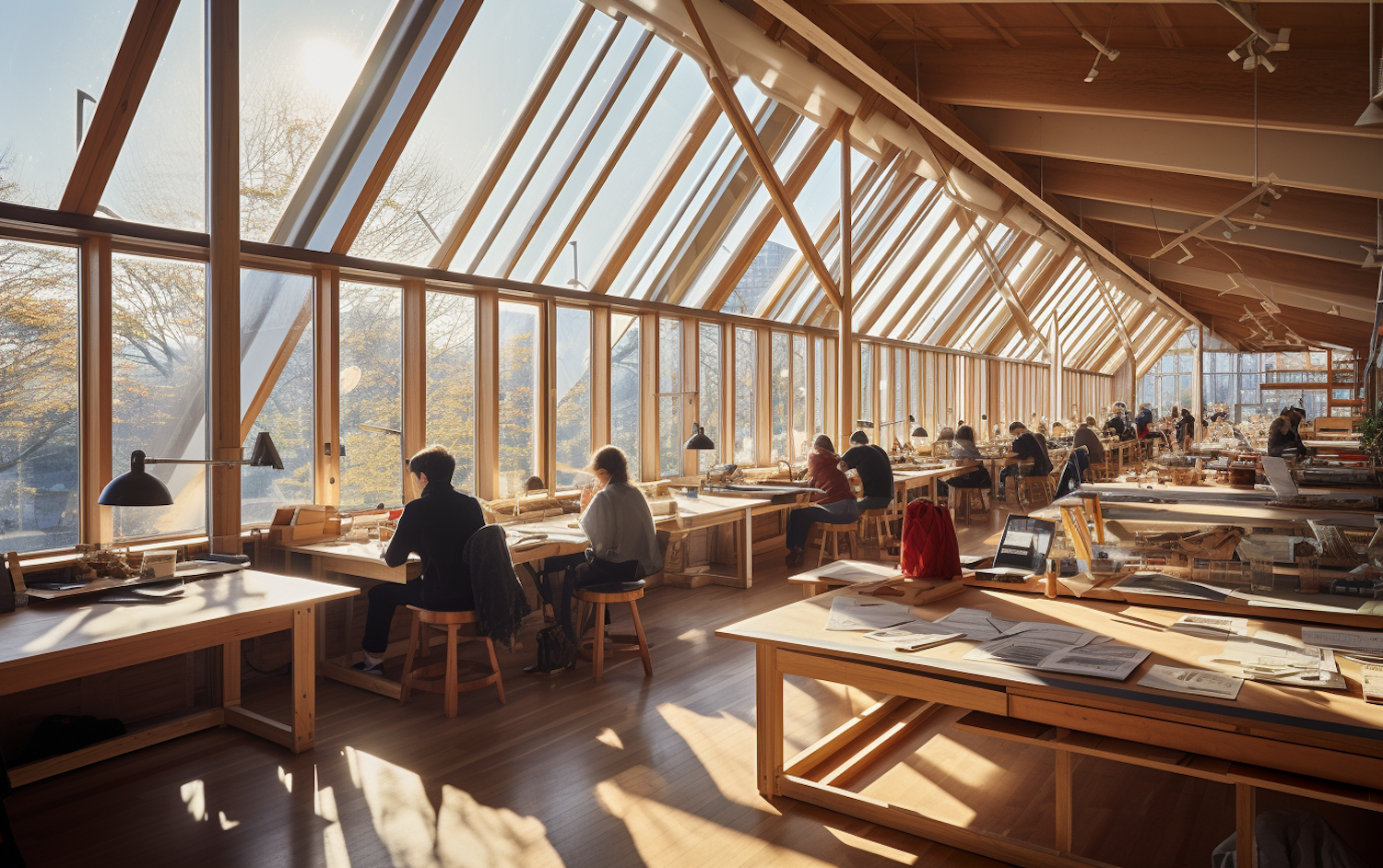 Sunlit workspace with large windows, wooden tables, and people working on projects. Warm, creative atmosphere with autumn views outside.