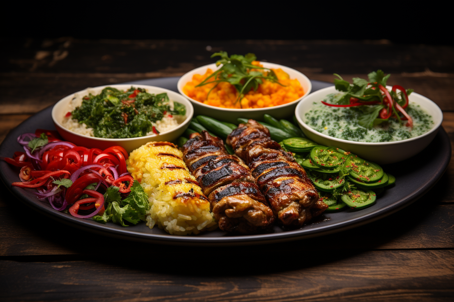 A colorful platter with grilled meat skewers, yellow rice, pickled veggies, and assorted side dishes on a rustic wooden table.