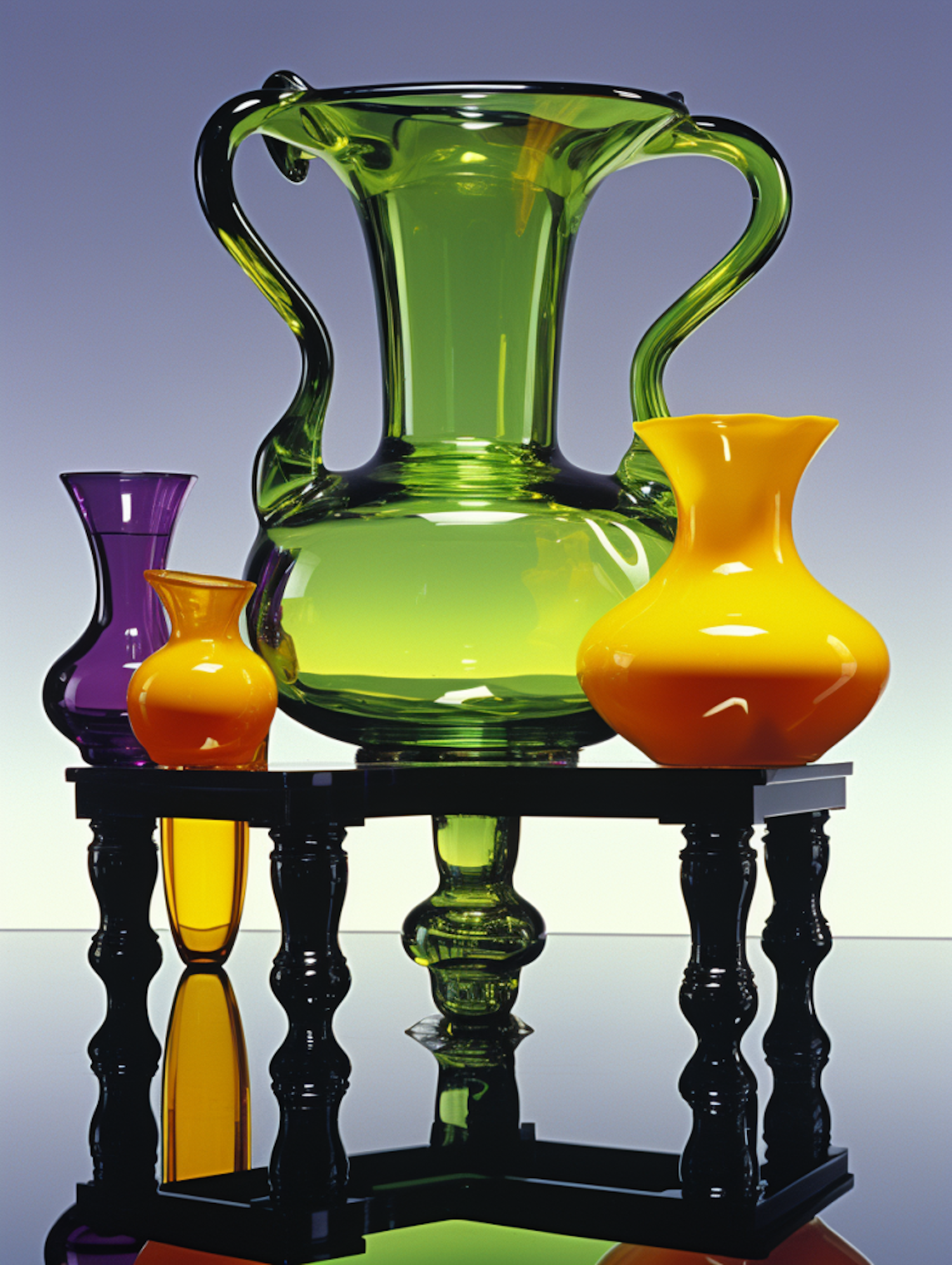 Vibrant glass vases in green, yellow, purple, and orange on a reflective surface, creating a stunning mirrored effect.