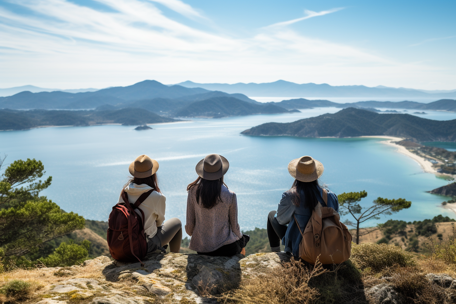 Three hikers with hats and backpacks enjoy a breathtaking coastal view from a rocky outcrop under a clear blue sky.