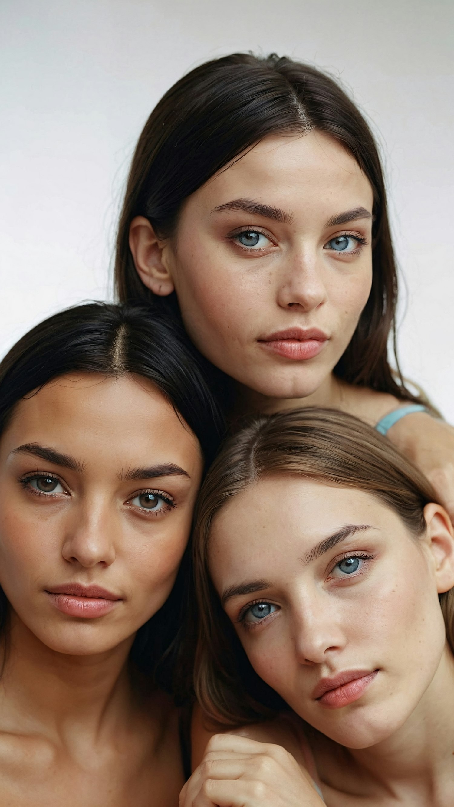 Three women with natural makeup and soft expressions pose closely together against a white background, highlighting their unique features.
