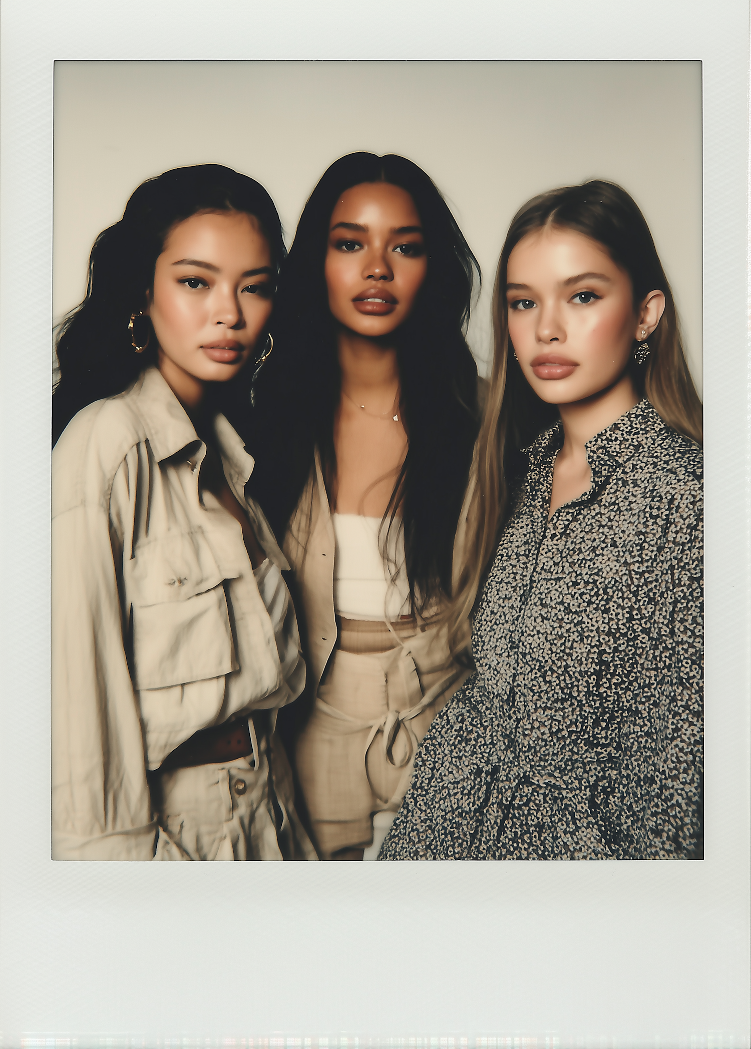Three stylish women pose together in neutral and patterned outfits, showcasing a modern and elegant aesthetic.
