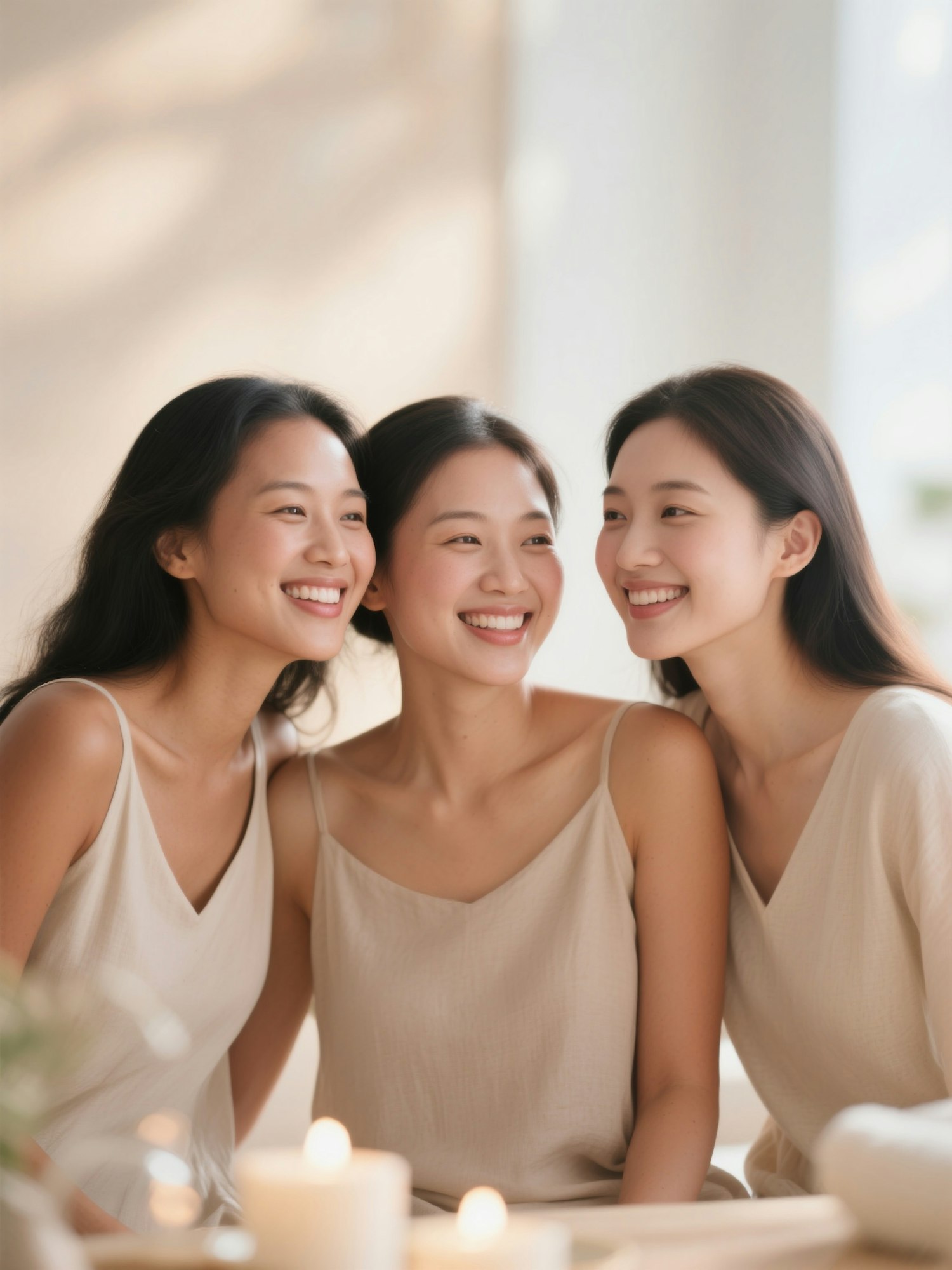 Three women in light beige outfits share smiles in a serene, softly lit setting with candles and greenery in the foreground.