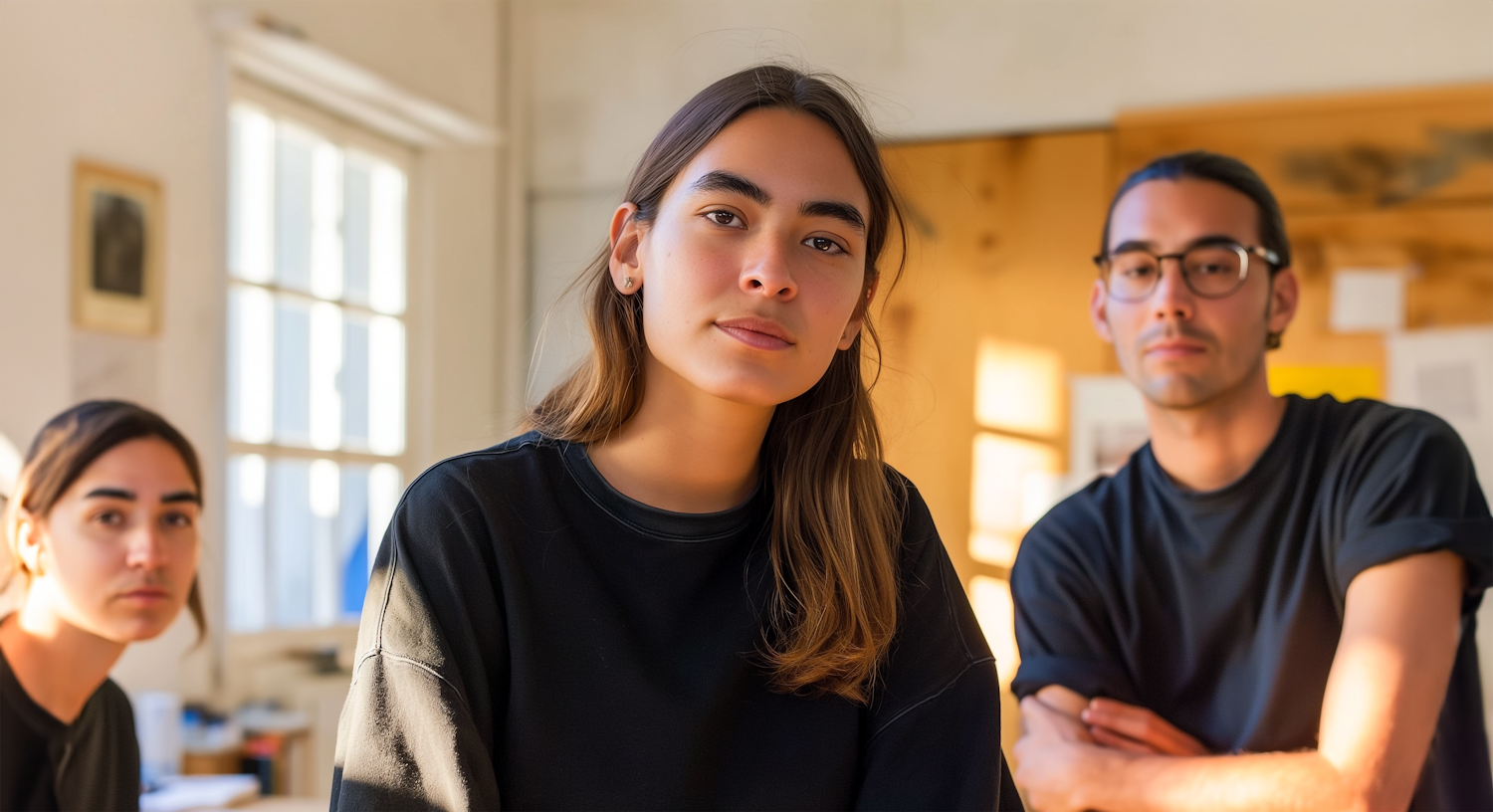 Three people in a sunlit room, wearing black shirts, with a warm and inviting atmosphere.