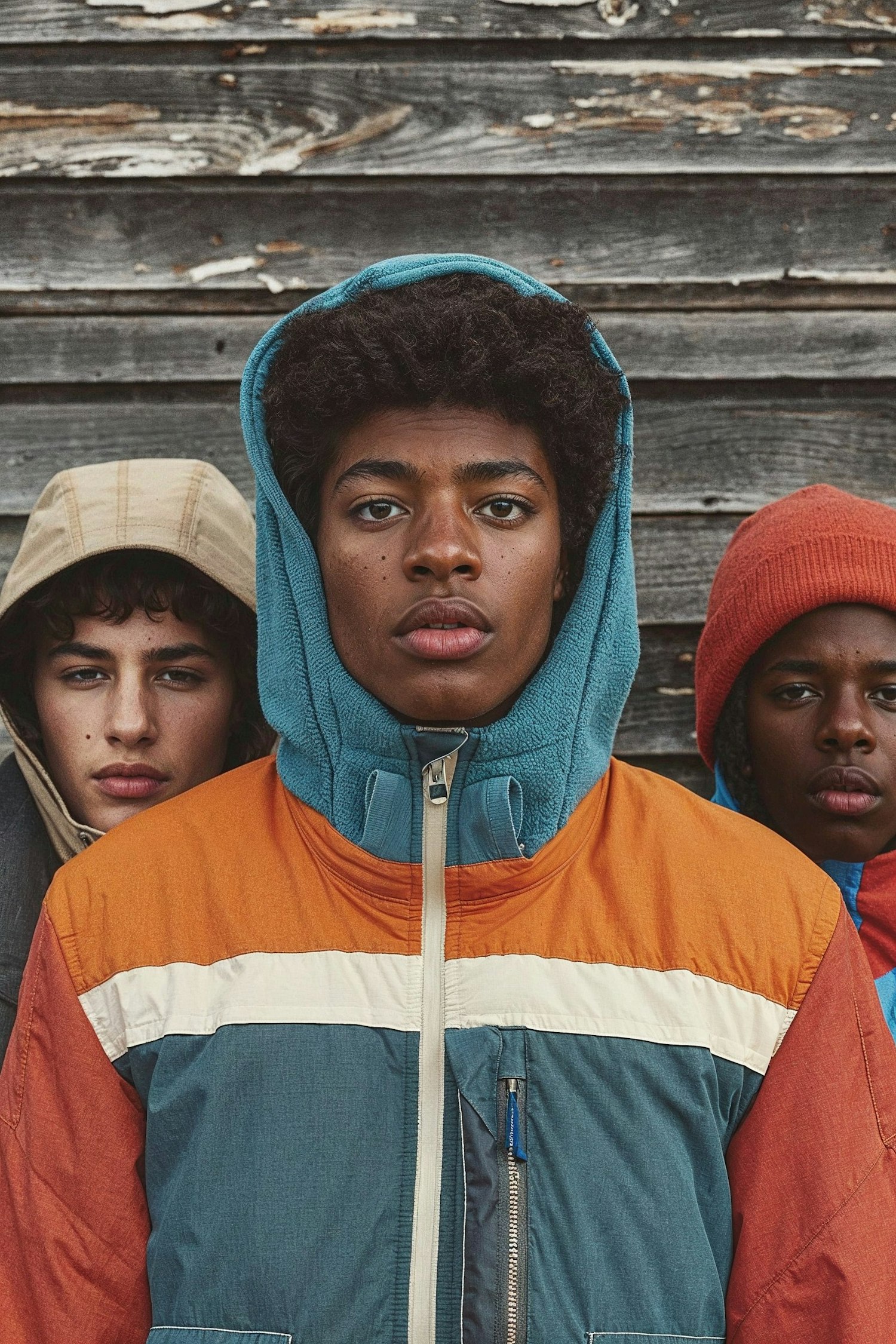 Three diverse individuals in colorful jackets stand against a rustic wooden wall, showcasing unity and style.