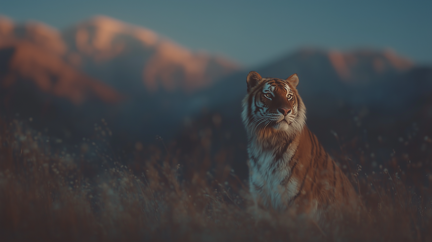 A tiger in a serene field with a mountain backdrop at sunset, showcasing its majestic presence and the beauty of nature.
