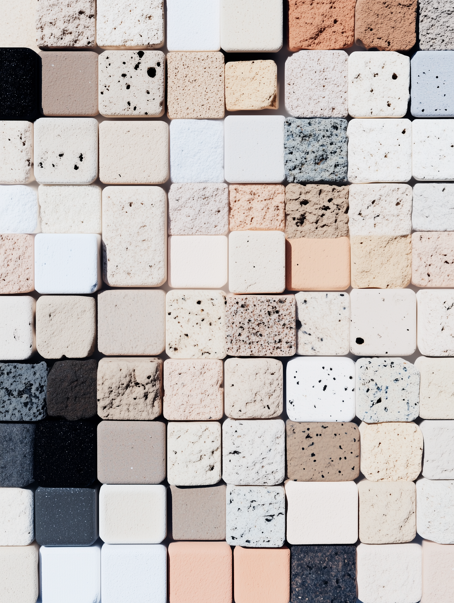 A grid of textured tiles in various colors and patterns, including white, beige, gray, and black, creating a visually appealing mosaic.