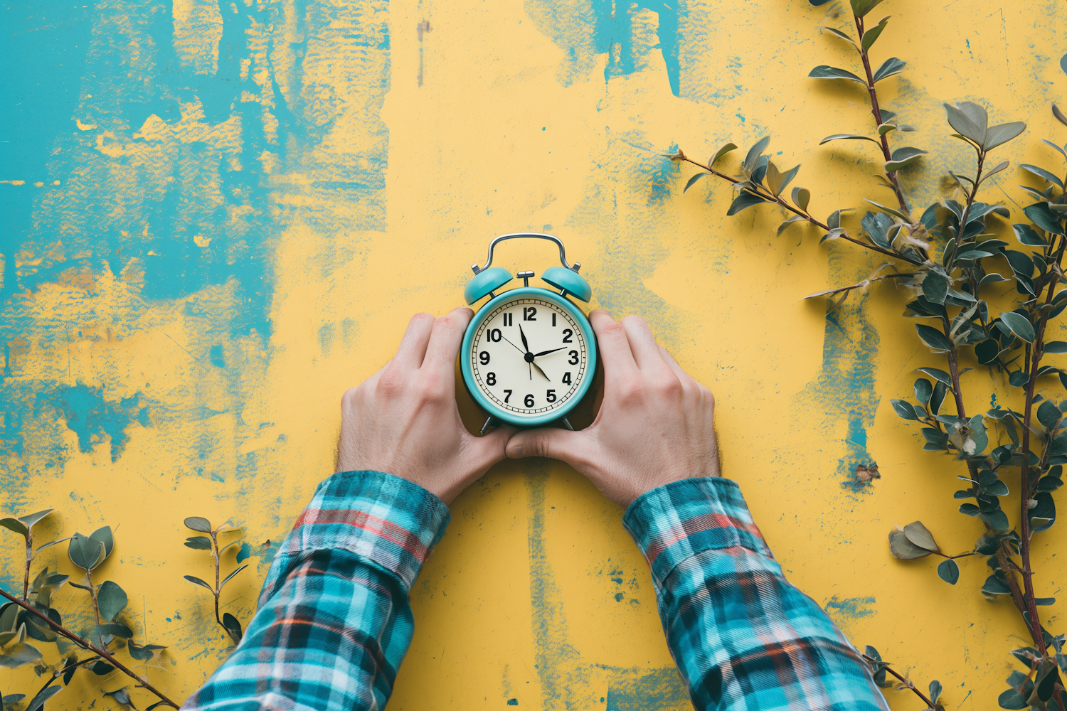 Hands holding a blue alarm clock against a vibrant yellow and teal background with green leaves. Time displayed is 10:10.