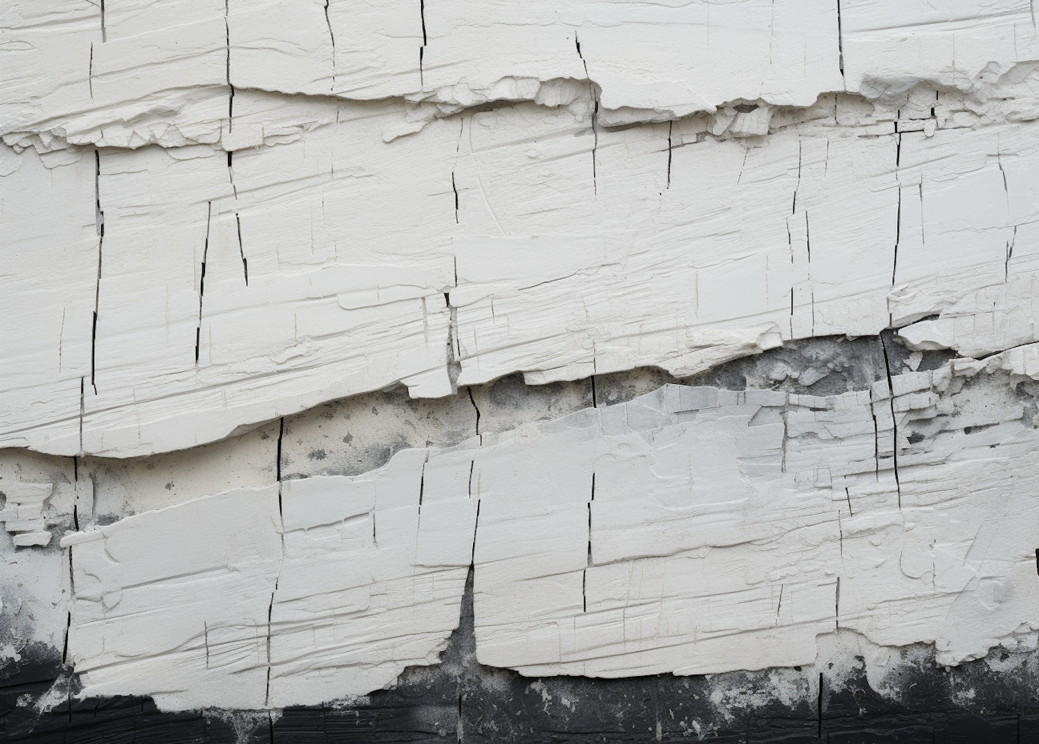 Close-up of a cracked, textured surface with peeling white paint and visible gray and black layers underneath.
