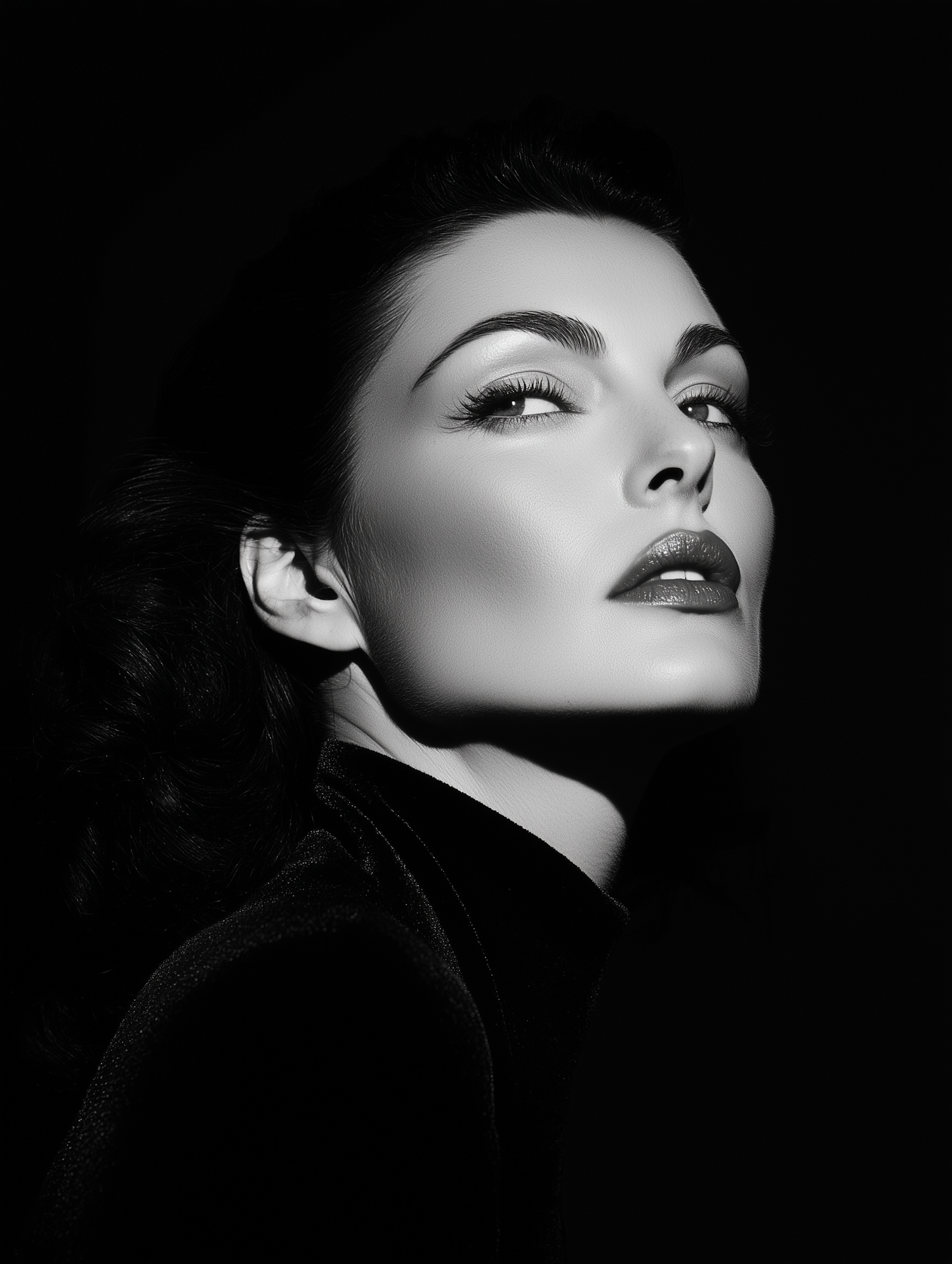 Elegant black and white portrait of a woman with classic beauty, dramatic lighting, and a serene expression.