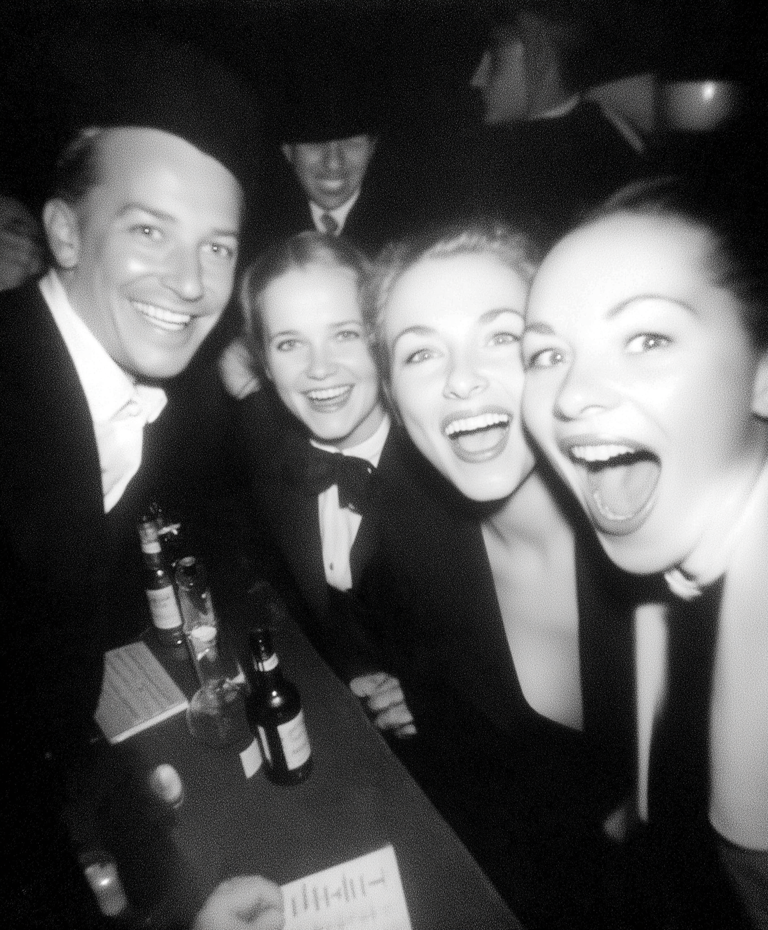 A lively black-and-white photo of friends in formal attire, laughing and enjoying a festive gathering with drinks on the table.