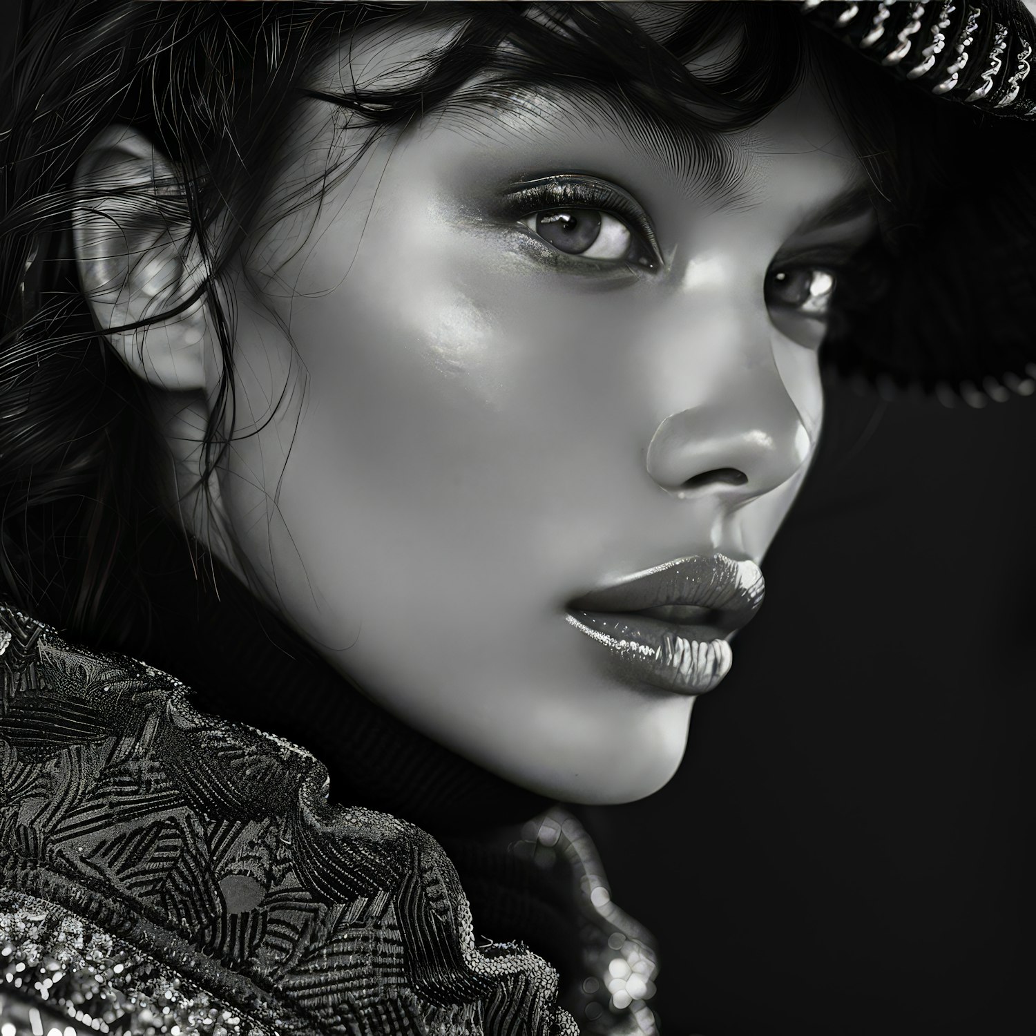 Black and white close-up portrait of a woman with dramatic makeup, glossy lips, and a stylish hat, exuding elegance and sophistication.