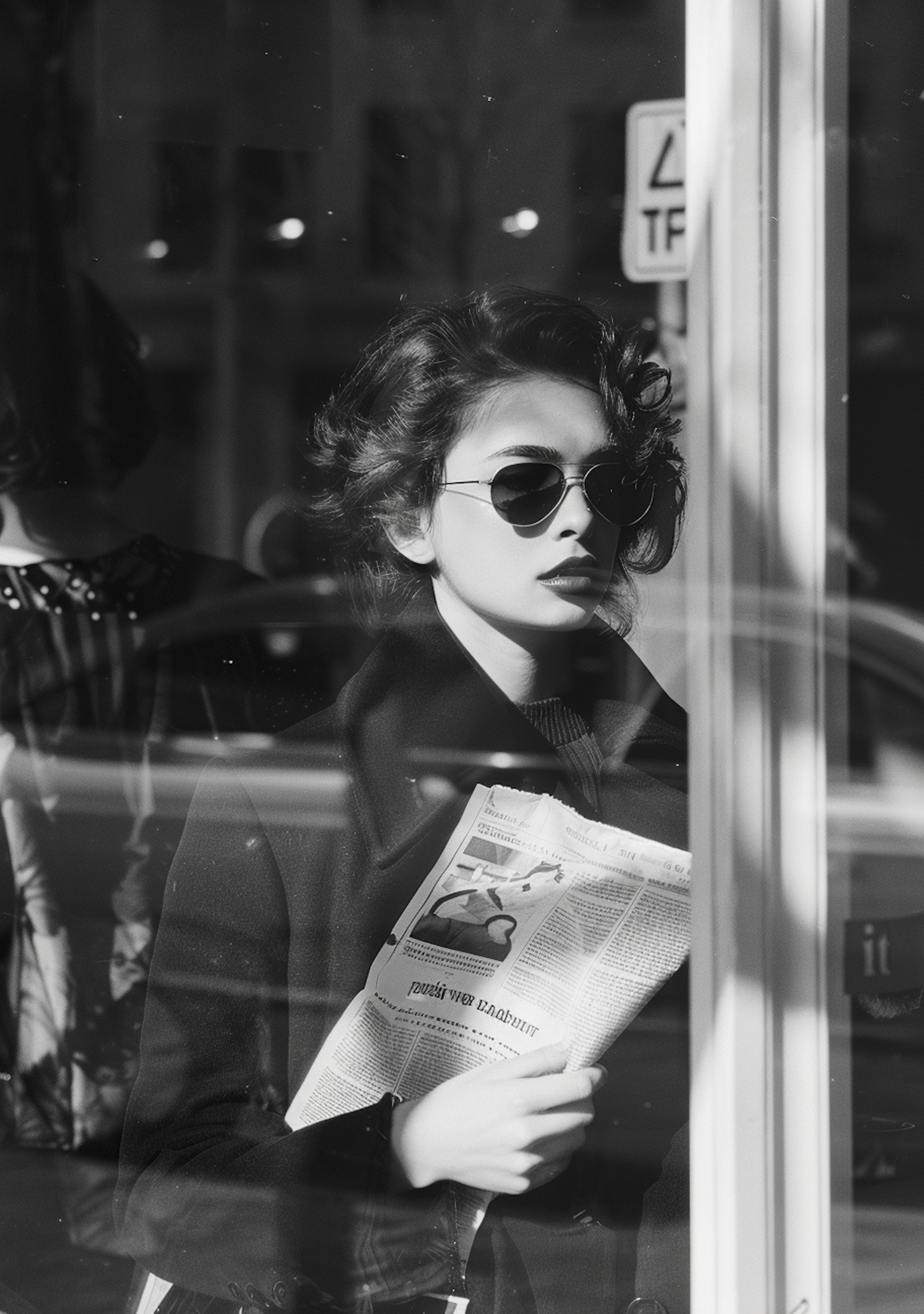 Stylish woman with sunglasses and newspaper behind glass, in a black and white urban scene. Reflective street elements add depth.