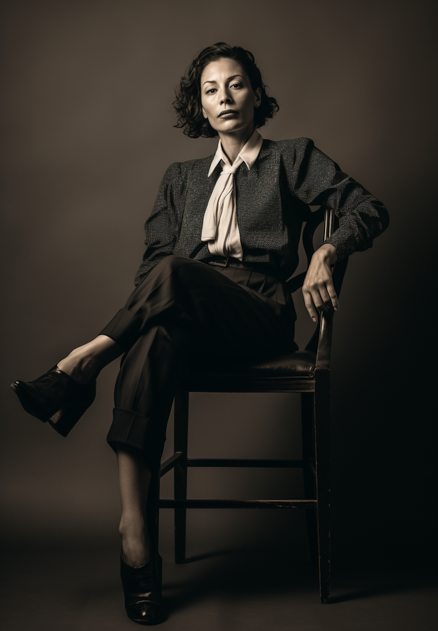 Vintage-style portrait of a woman in a blazer and bow tie, sitting confidently on a chair with a serious expression.