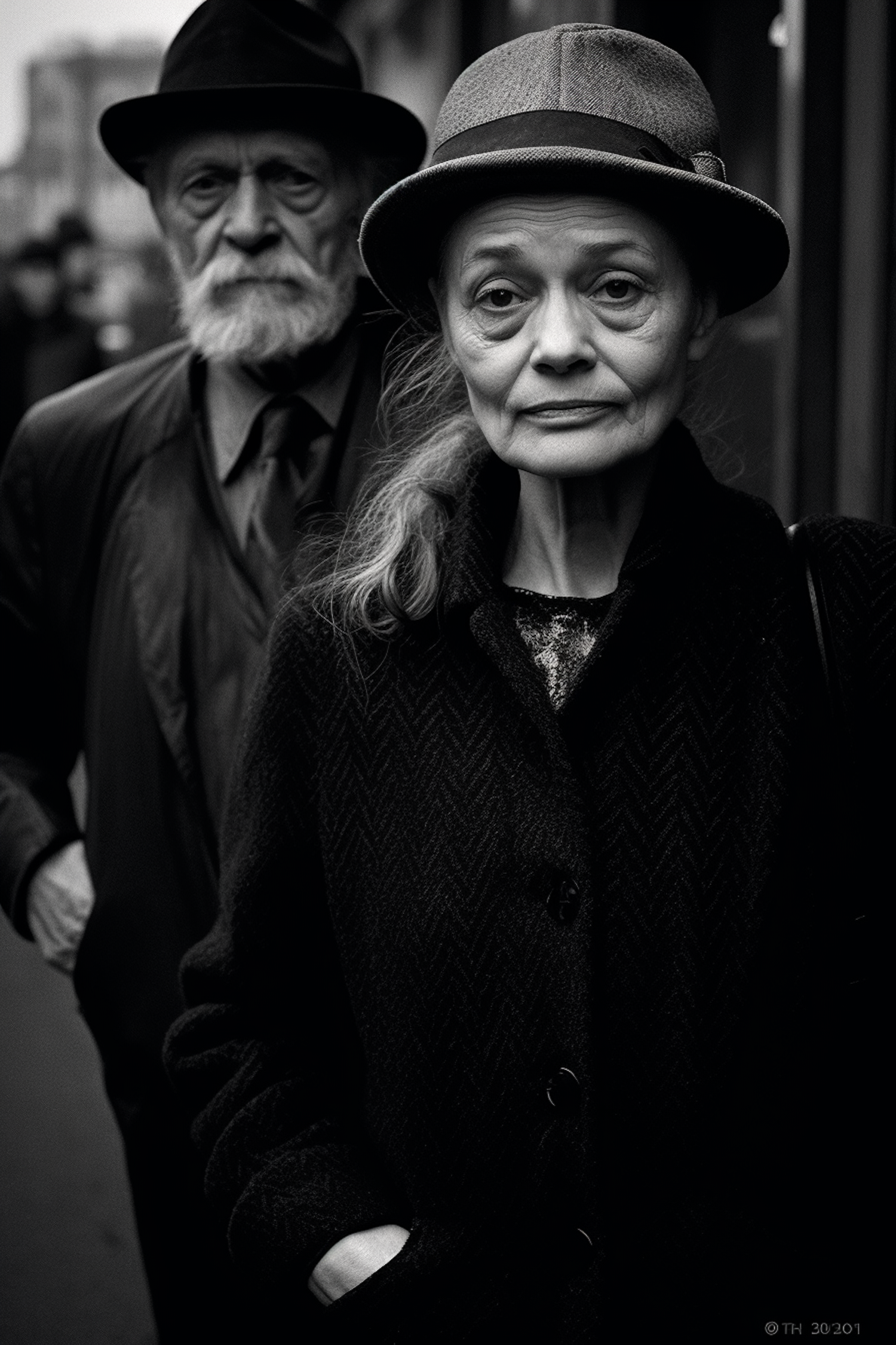 Black and white portrait of an elderly couple in hats and coats, exuding a timeless and contemplative mood.