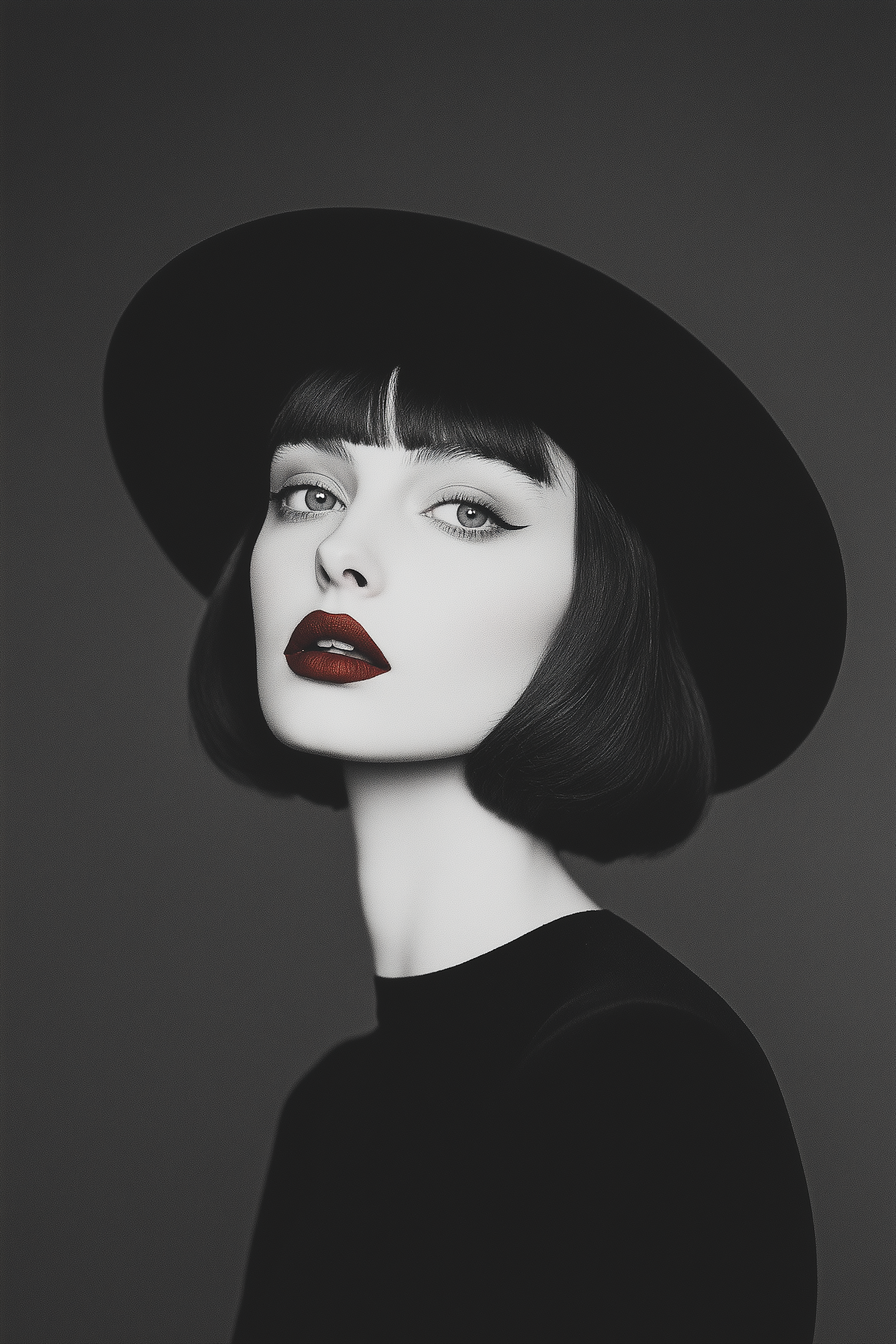Elegant black and white portrait of a woman in a wide-brimmed hat, with striking red lips and bold eyeliner.