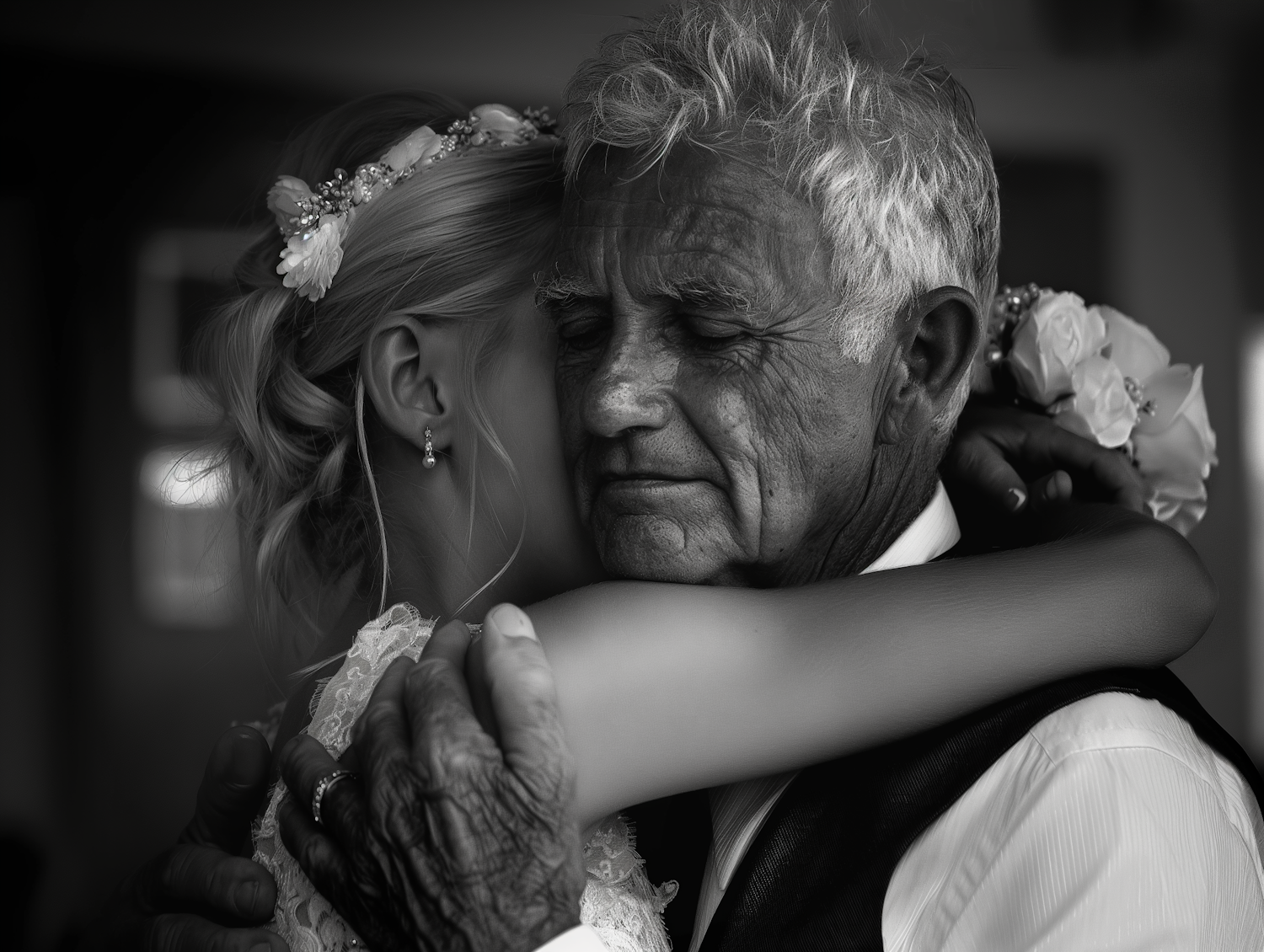 Tender embrace between an elderly man and a young woman, capturing a moment of warmth and connection in black and white.
