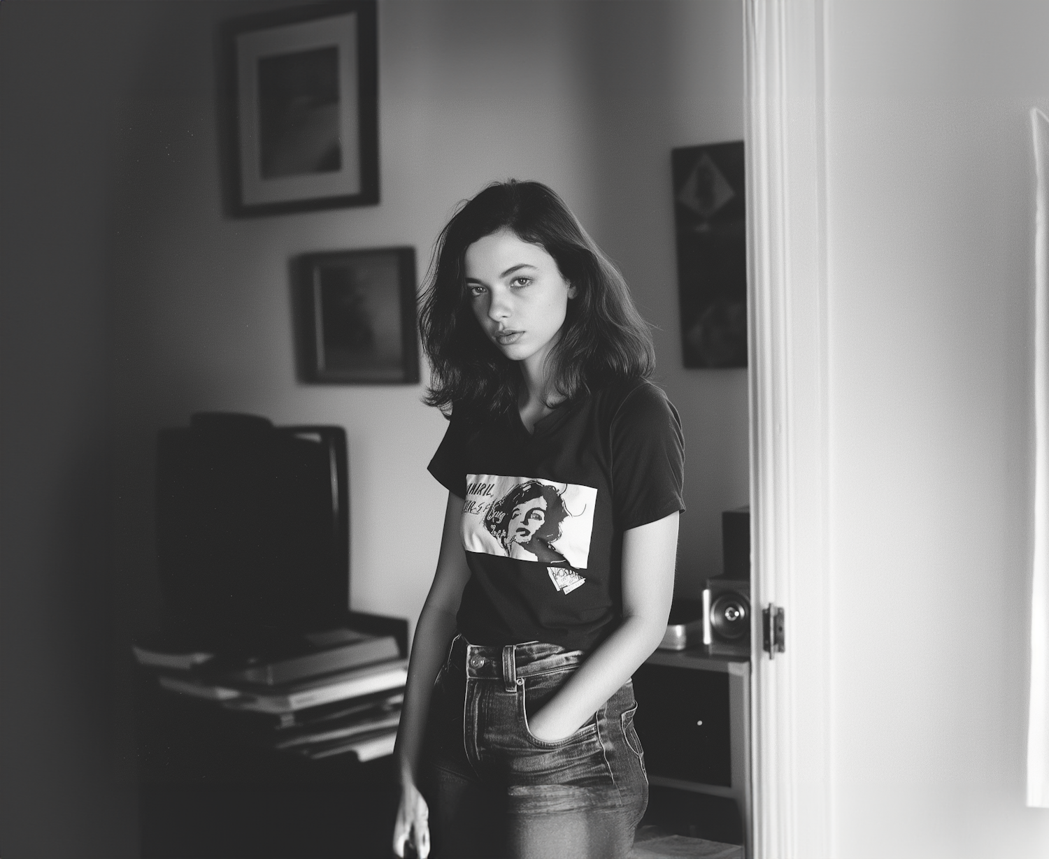 Monochrome portrait of a young woman in a graphic tee, standing in a softly lit room with a serious expression.