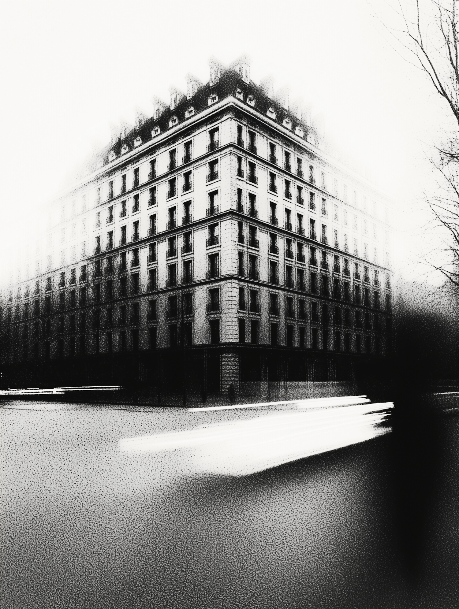 Monochromatic image of a grand building in fog, with light streaks from moving vehicles creating a dynamic contrast.