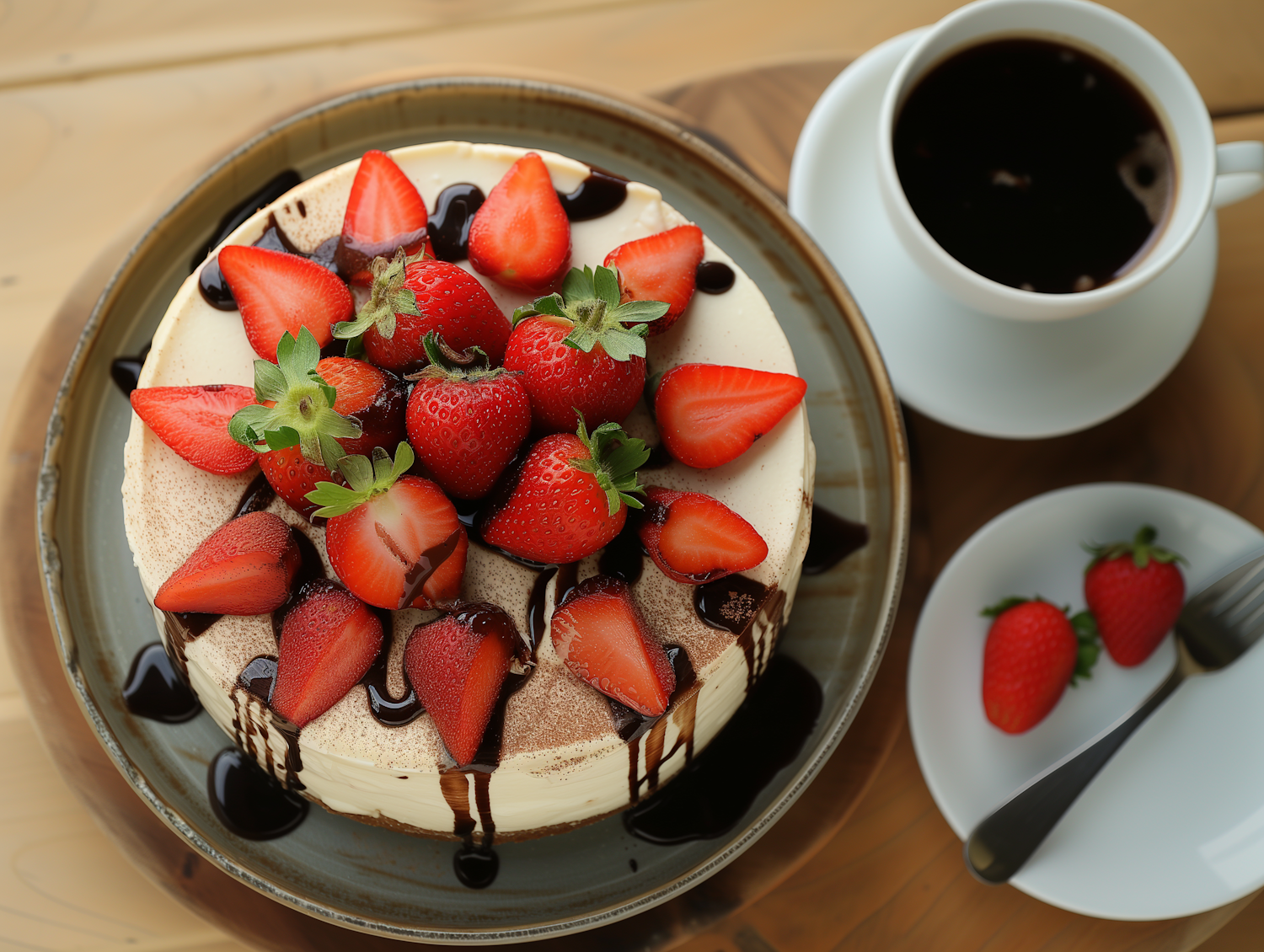 Delicious cheesecake topped with fresh strawberries and chocolate drizzle, served with a cup of coffee on a rustic wooden table.