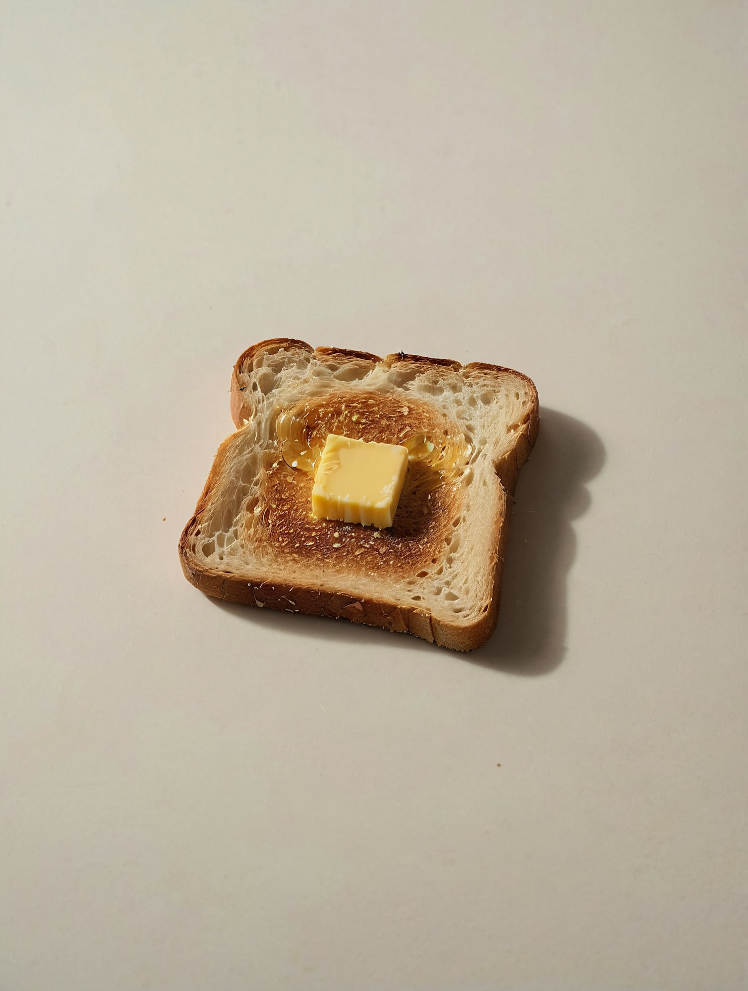 Golden toast with melting butter and honey drizzle on a beige surface, creating a simple and appetizing breakfast vibe.