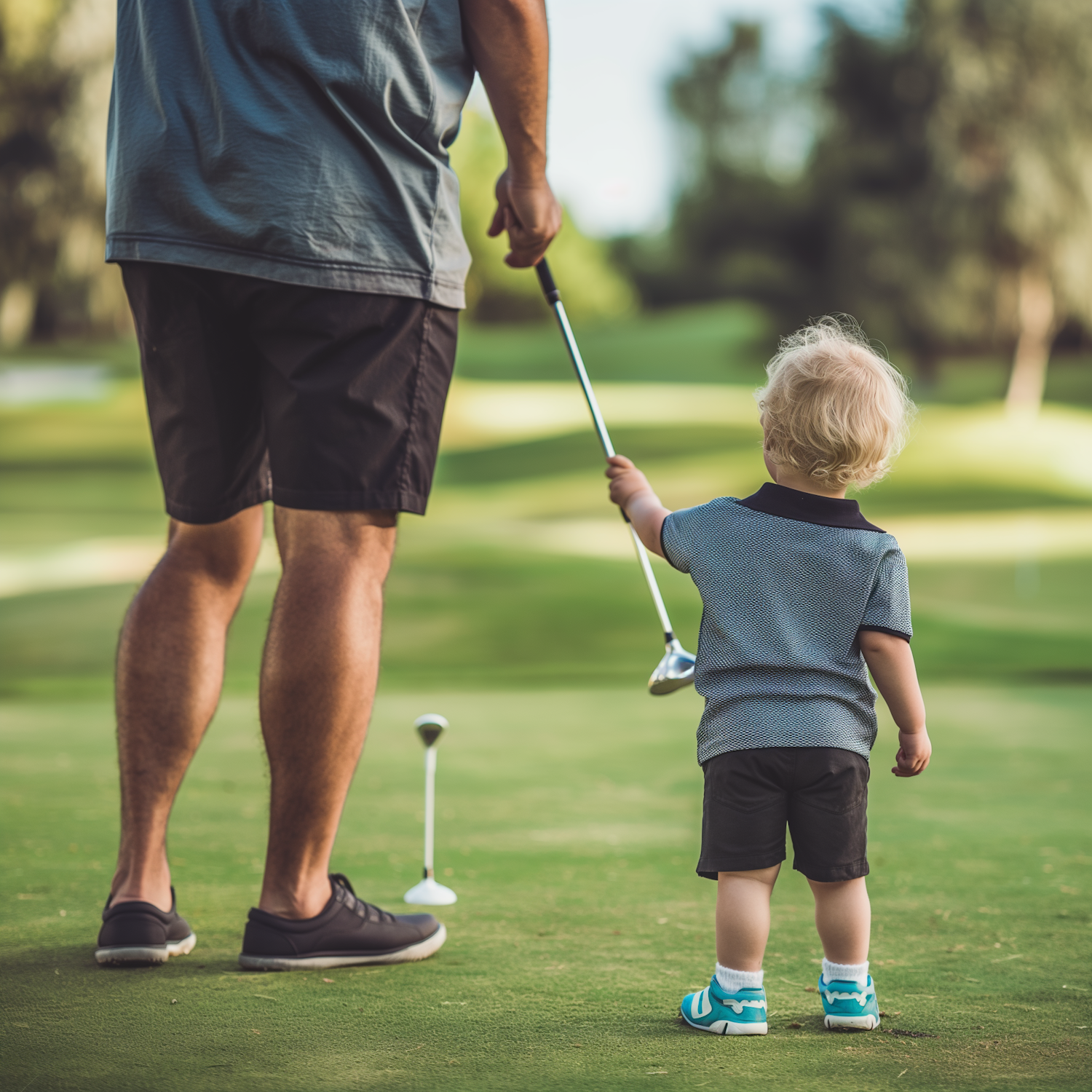 A child and adult enjoy a sunny day on the golf course, sharing a moment with golf clubs in hand.
