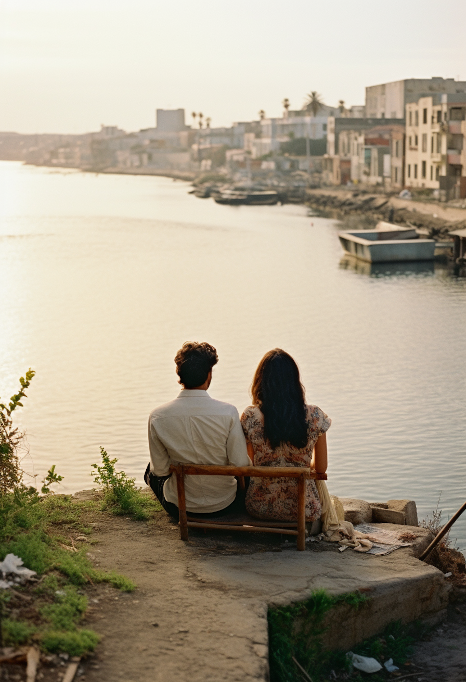 A couple sits on a bench by a river at sunset, surrounded by serene water and an urban backdrop of buildings and palm trees.
