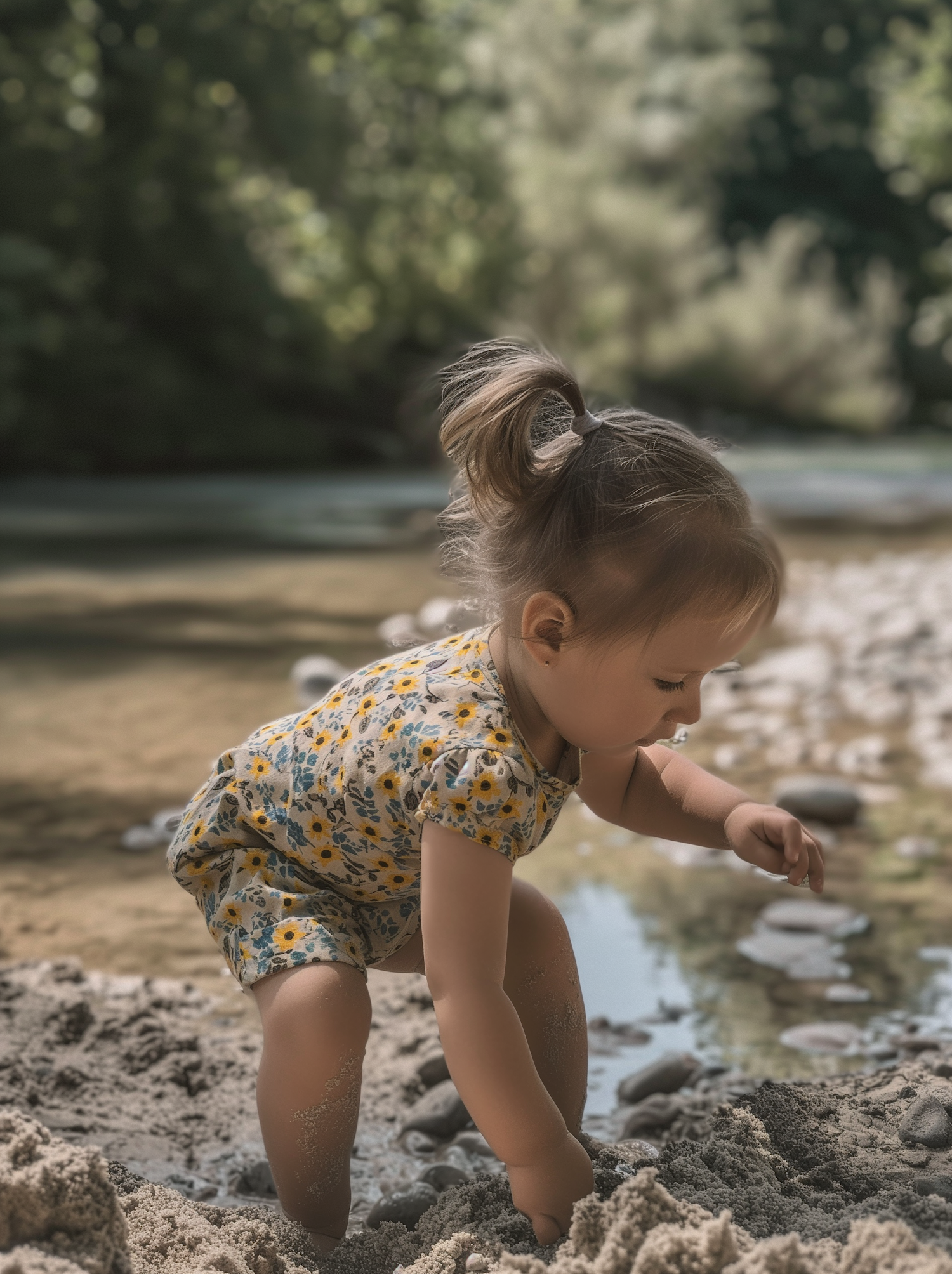 A young child in a floral outfit plays in the sand by a river, surrounded by lush greenery and sunlight filtering through trees.