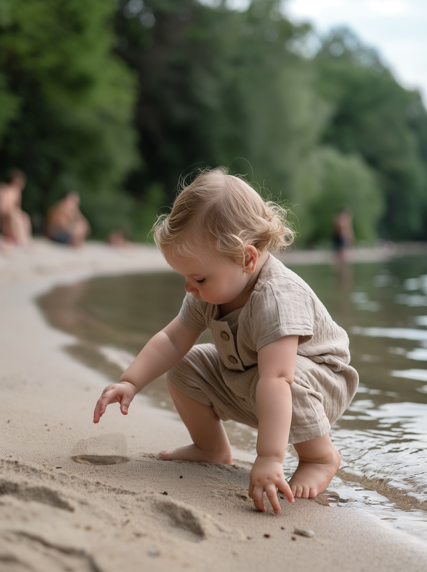 A young child with blonde hair plays on a sandy beach, touching the sand near the water's edge. The scene is serene and playful.