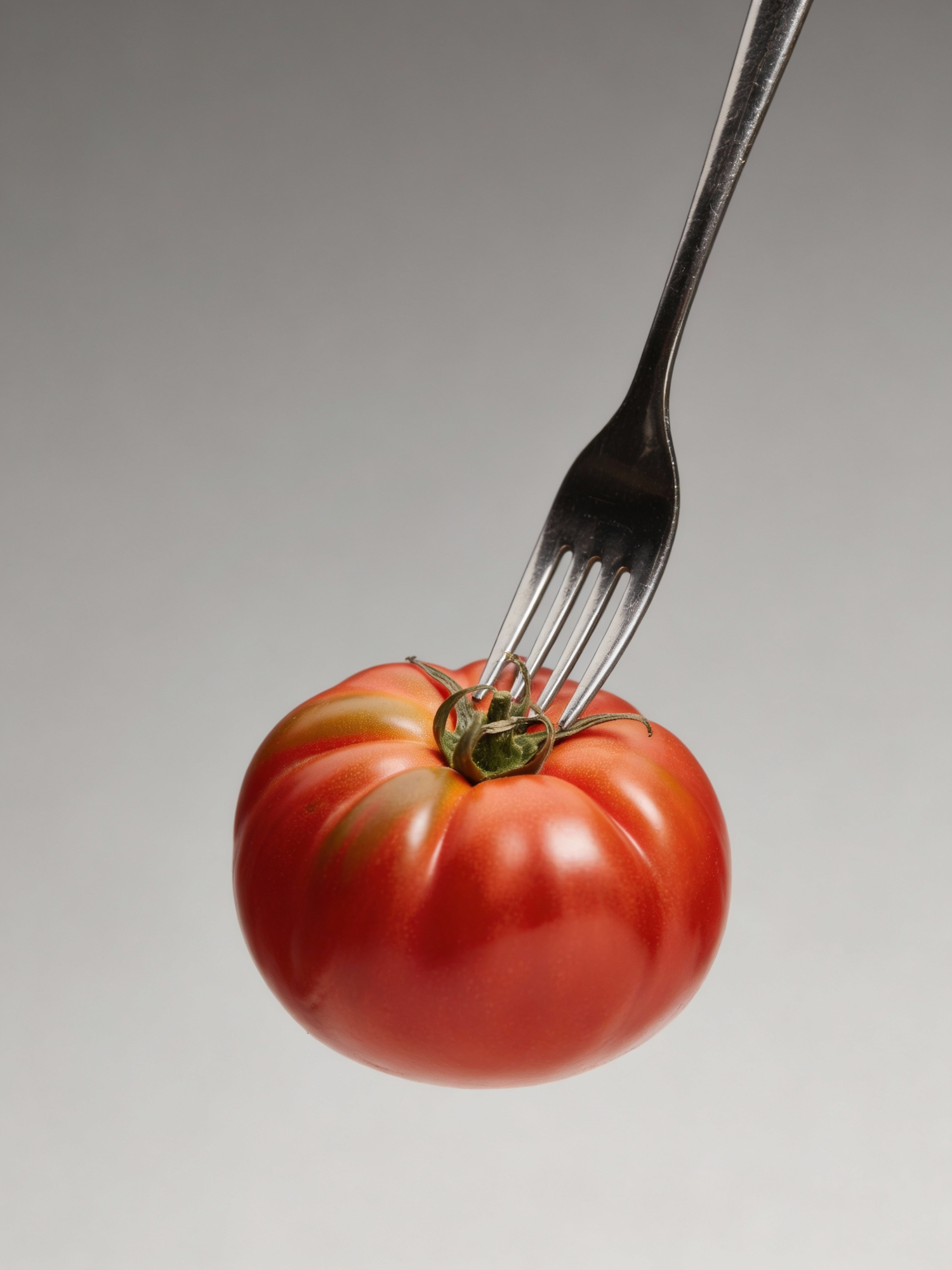 A fresh red tomato pierced by a silver fork, set against a neutral background, showcasing vibrant colors and a minimalist aesthetic.