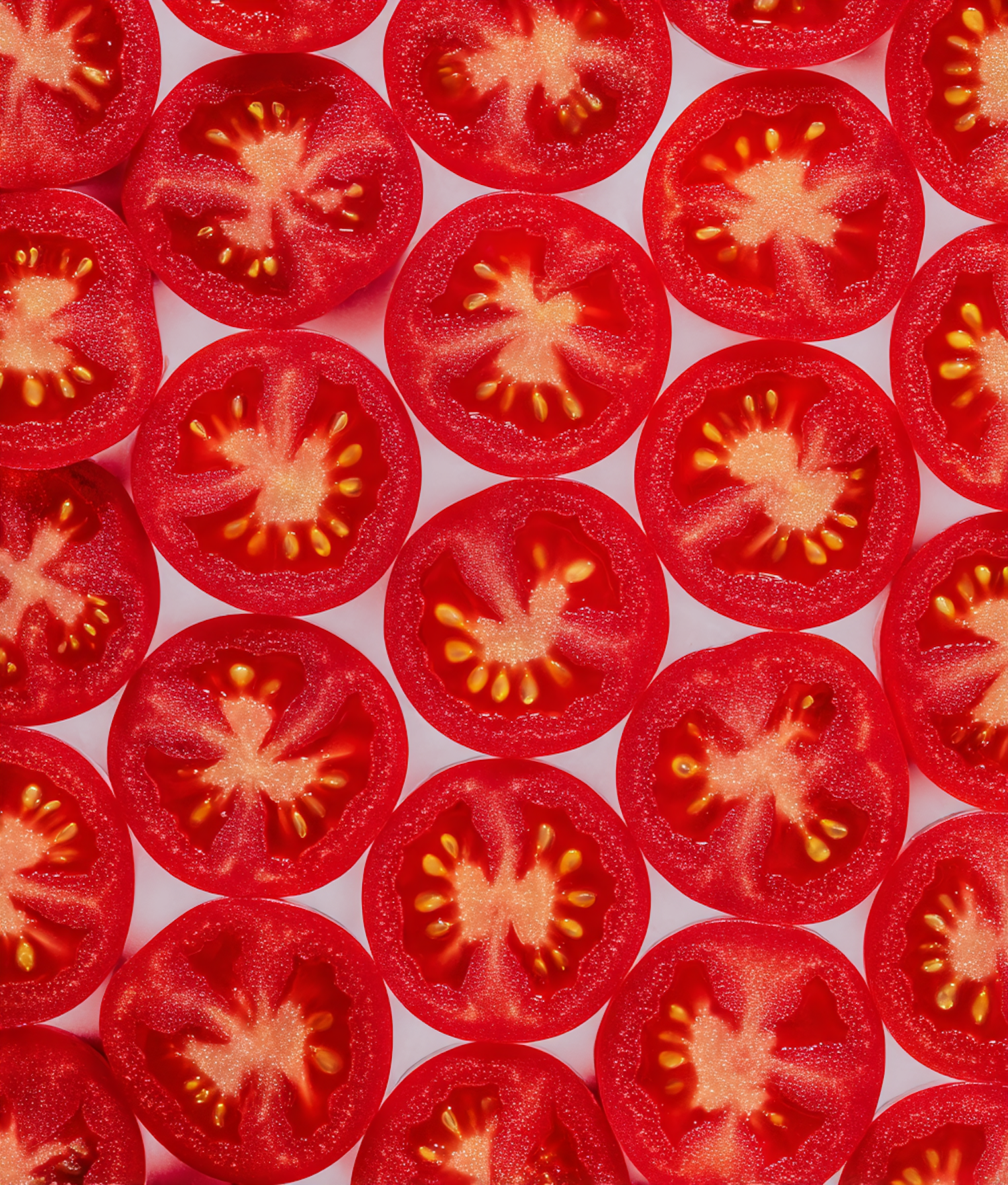 Close-up of vibrant red tomato slices arranged in a grid, showcasing their juicy texture and seeds against a clean white background.