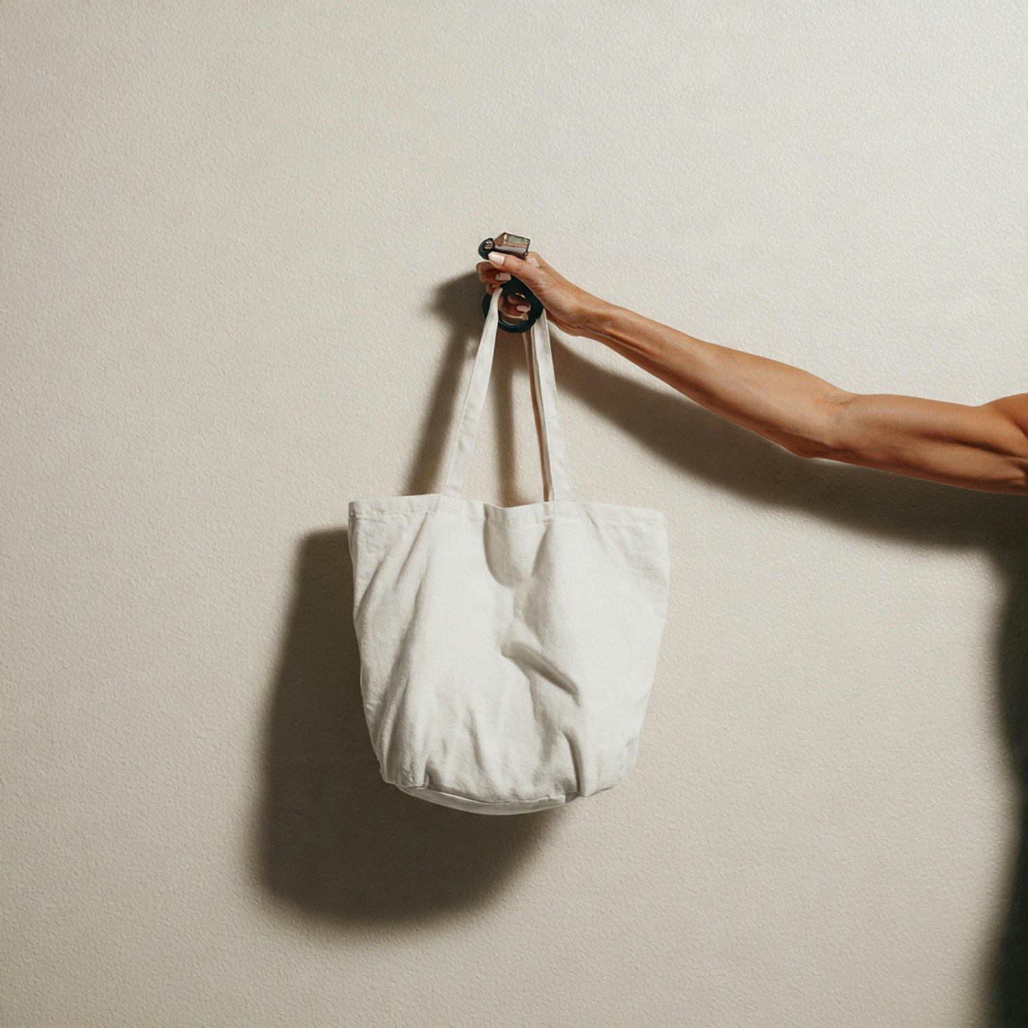 A tanned arm holds a white canvas tote bag against a neutral wall, showcasing the bag's simple design and the arm's defined muscles.