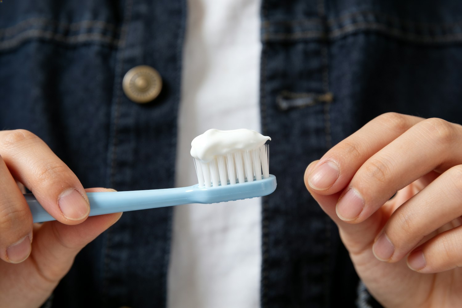 Close-up of a toothbrush with toothpaste held by hands wearing a denim jacket, emphasizing oral hygiene essentials.