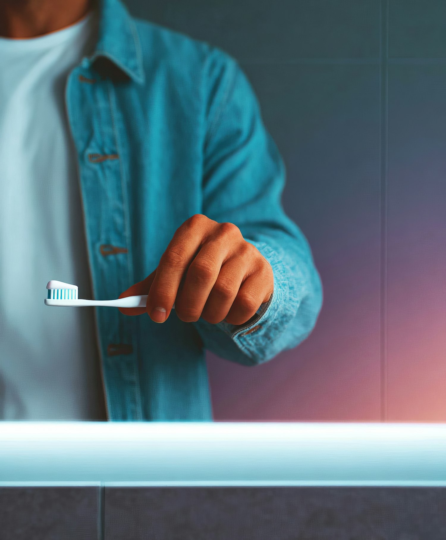 A person in a denim shirt holds a toothbrush with toothpaste in a modern bathroom setting with gradient lighting.