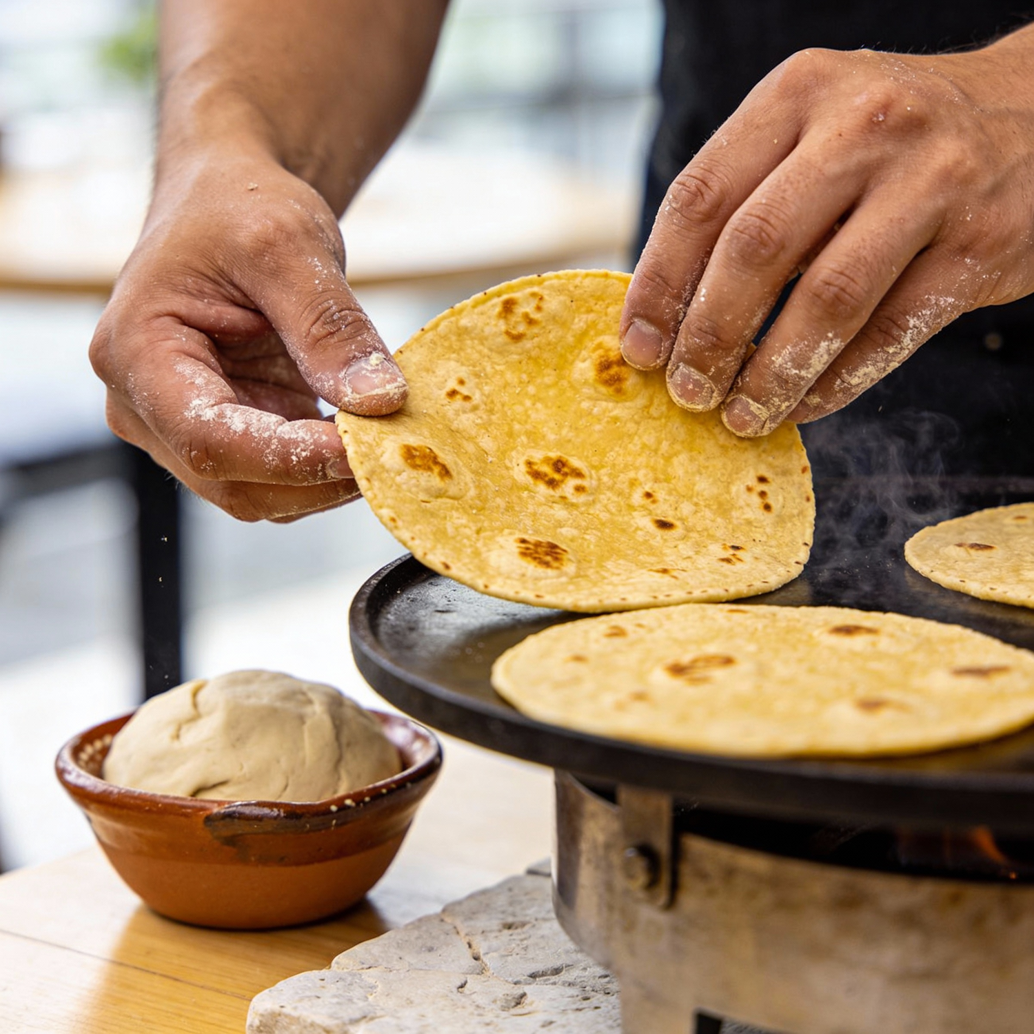 Hands preparing fresh tortillas on a hot griddle, with a bowl of dough nearby, showcasing a traditional cooking process.
