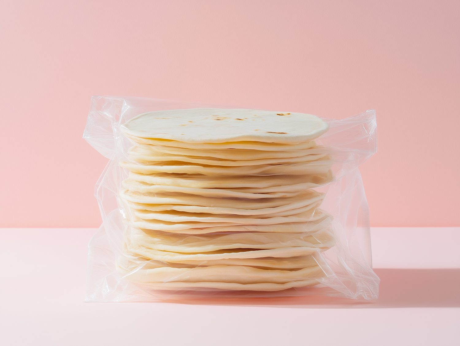 Stack of flour tortillas in a clear plastic bag against a soft pink background, showcasing fresh and neatly packaged tortillas.