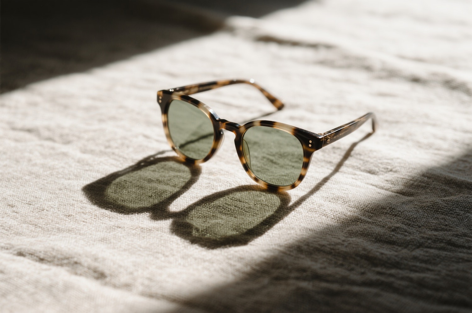 Stylish tortoiseshell sunglasses with green lenses resting on a beige fabric, illuminated by soft sunlight casting shadows.
