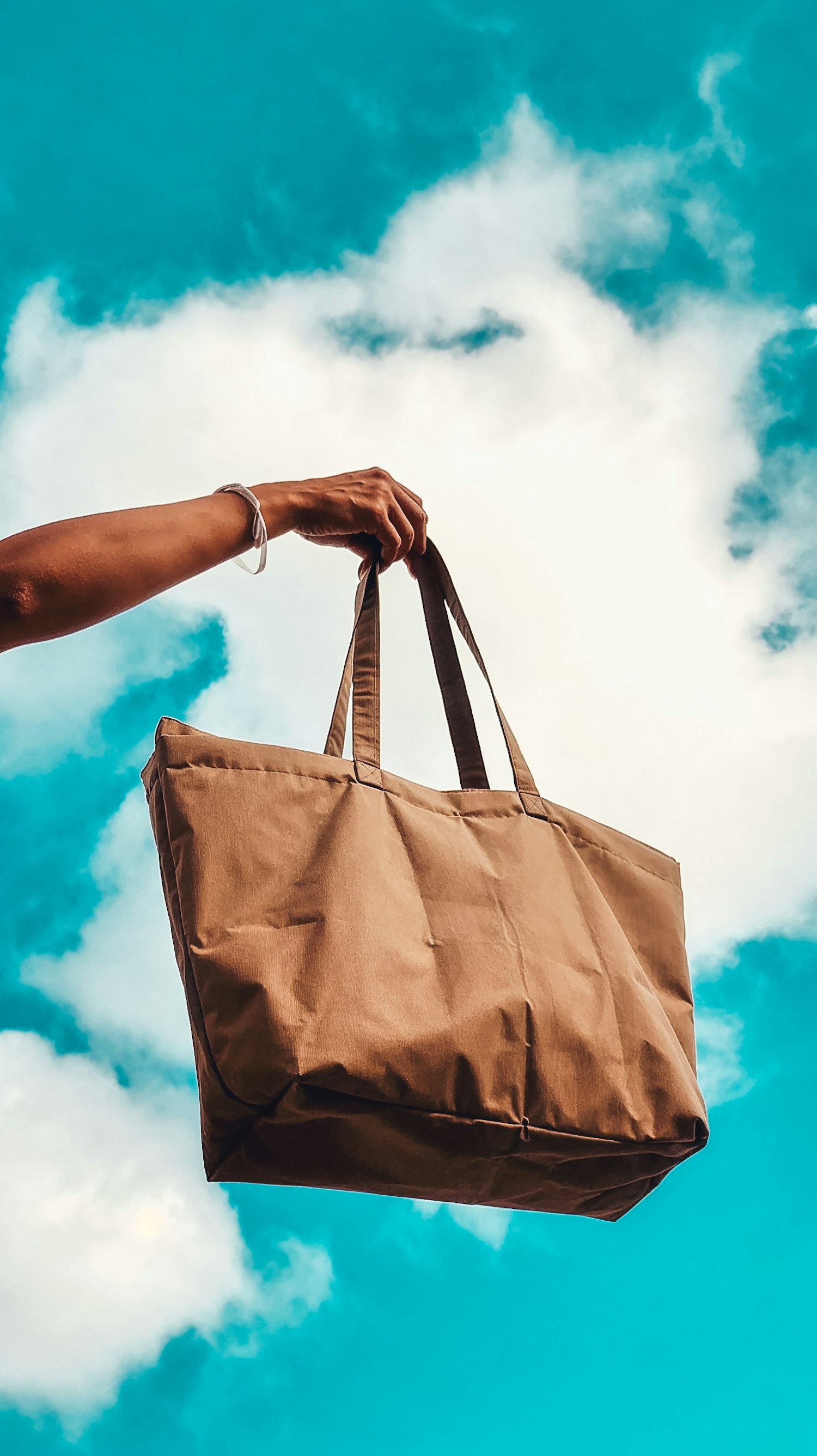A hand holding a brown tote bag against a bright blue sky with clouds, creating a minimalist and vibrant aesthetic.
