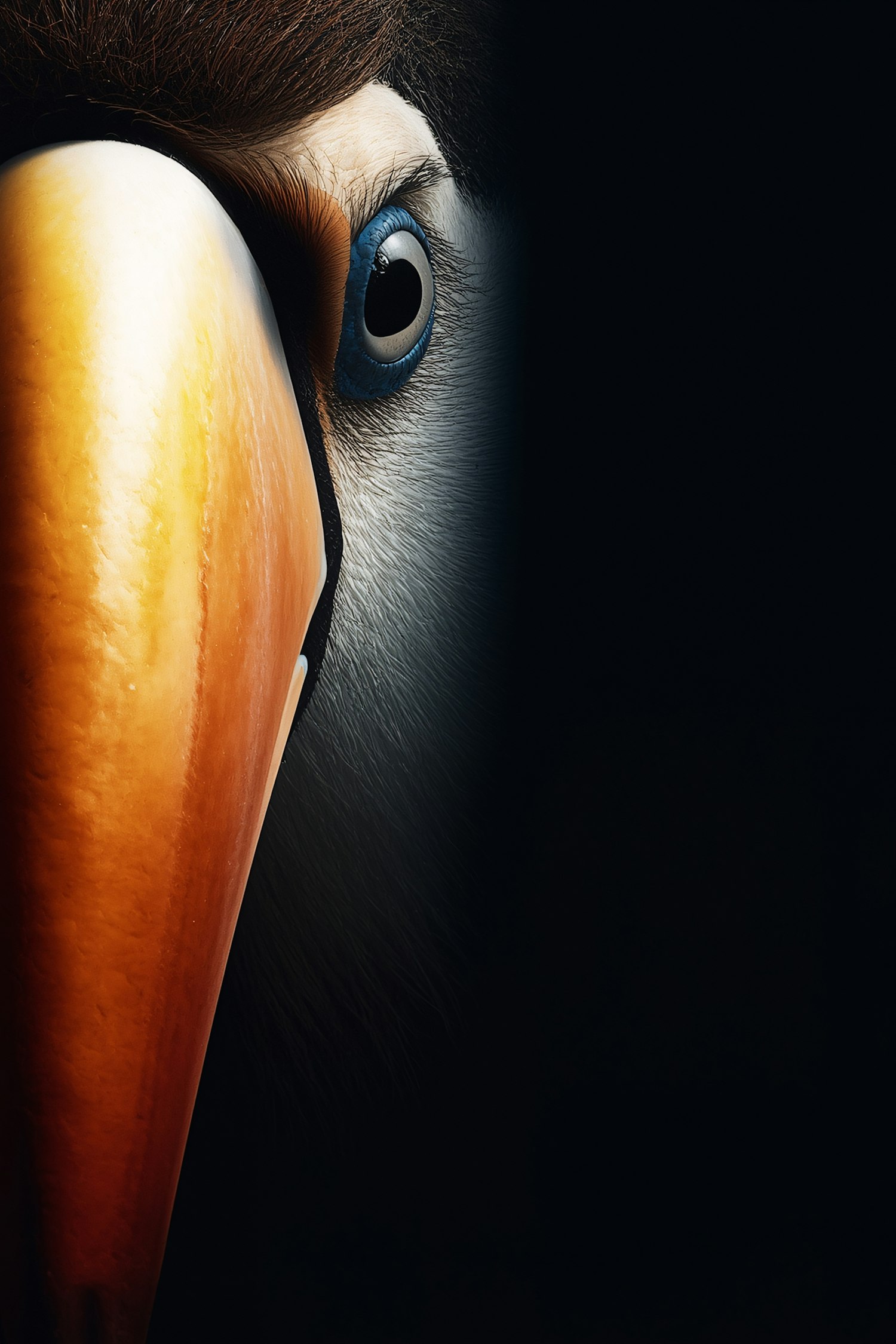 Close-up of a toucan's vibrant orange beak and blue eye against a dark background, showcasing intricate feather details.