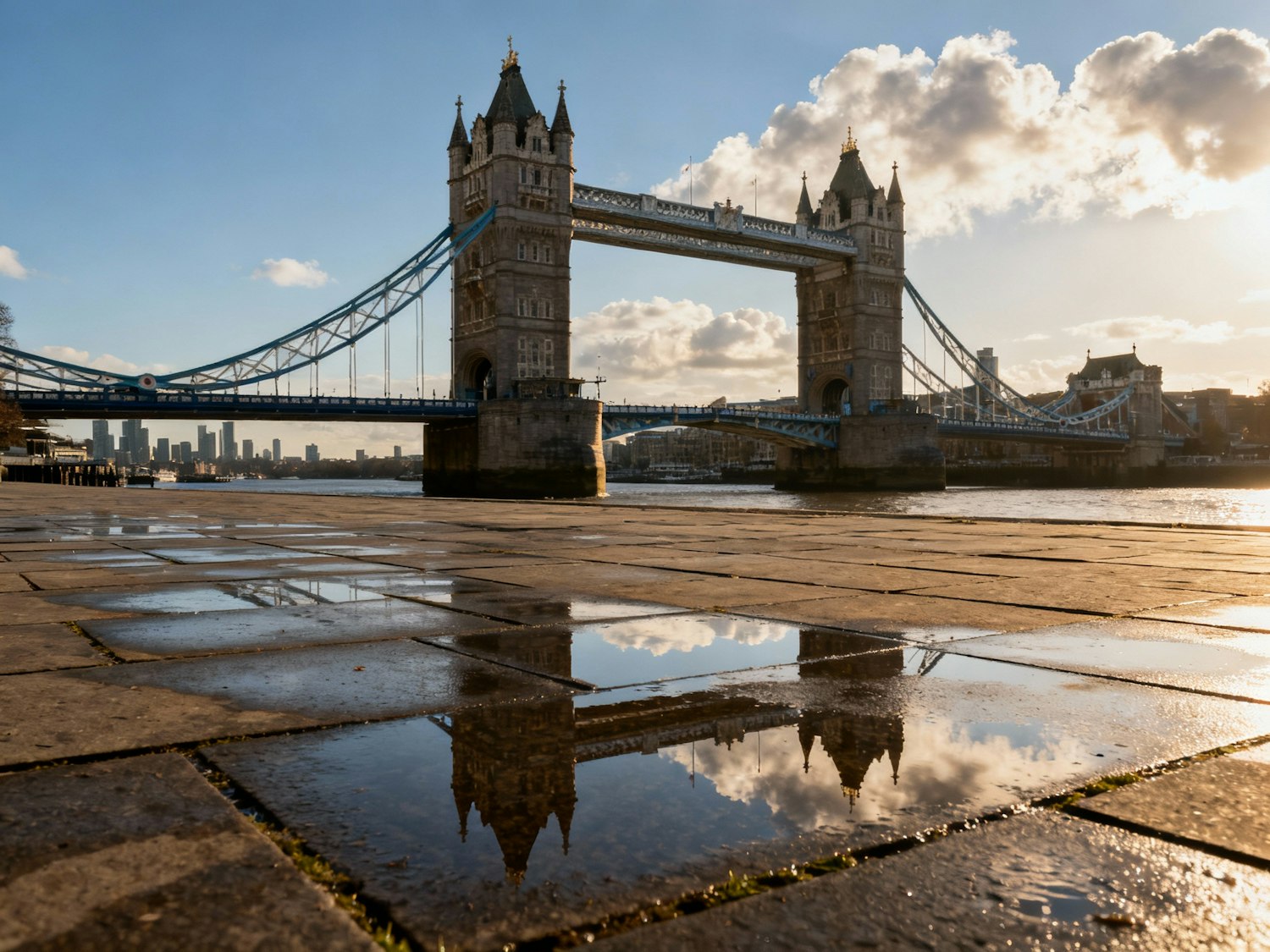 A stunning view of Tower Bridge in London, reflected in puddles on a wet pavement, with a clear sky and cityscape in the background.