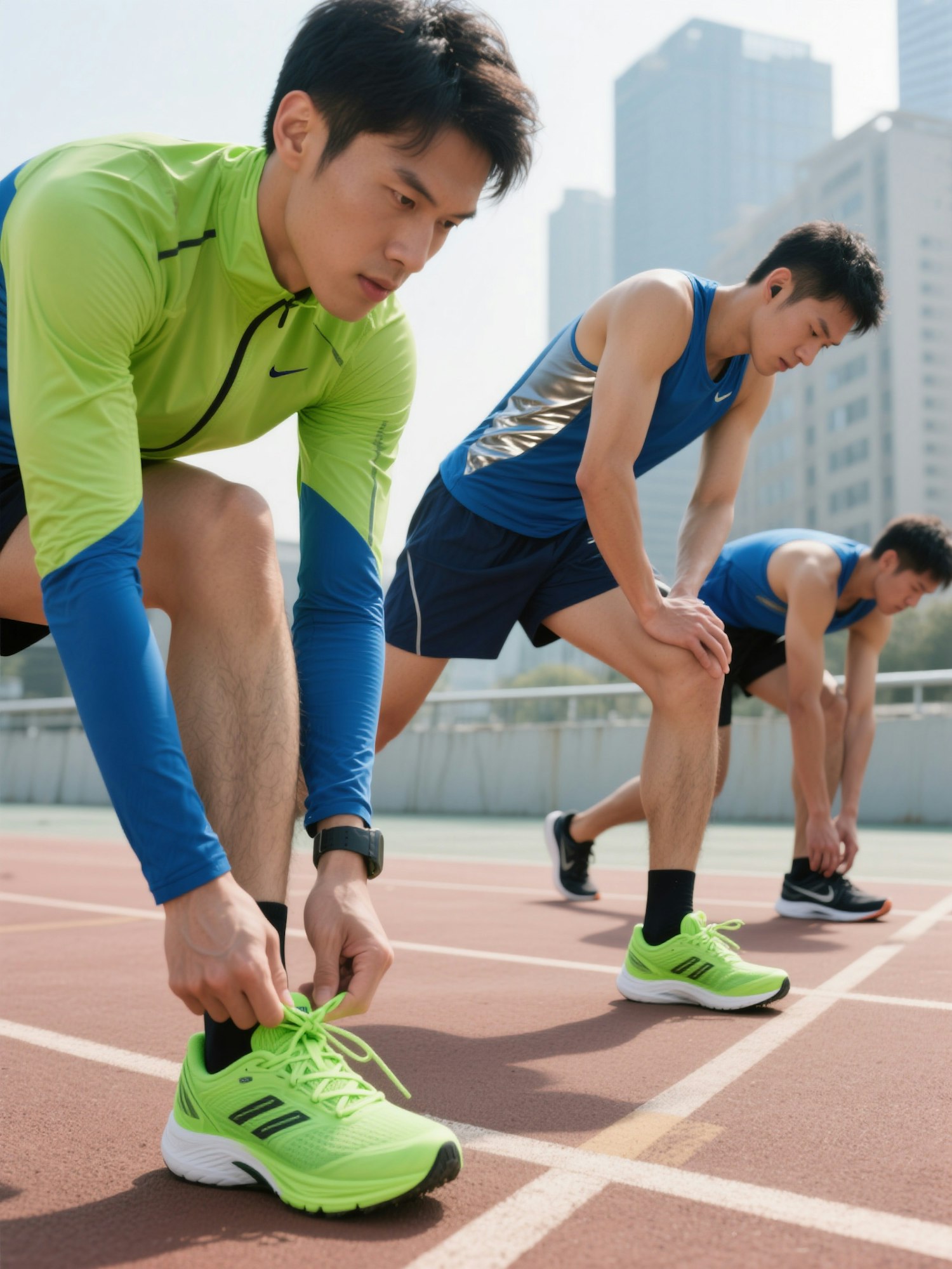 Highly realistic editorial photography, runners in motion, intense daylight, urban environment, dynamic blur, strong contrast, cinematic framing, close-up energy, minimal background, sporty fashion, aesthetic and modern style, natural colors with metallic accents, editorial sports magazine look. Group of three runners tying shoes and stretching on a track, captured in candid style, intense focus, mix of lime green, blue and navy sportswear, low angle, editorial composition, strong daylight with slight motion blur.