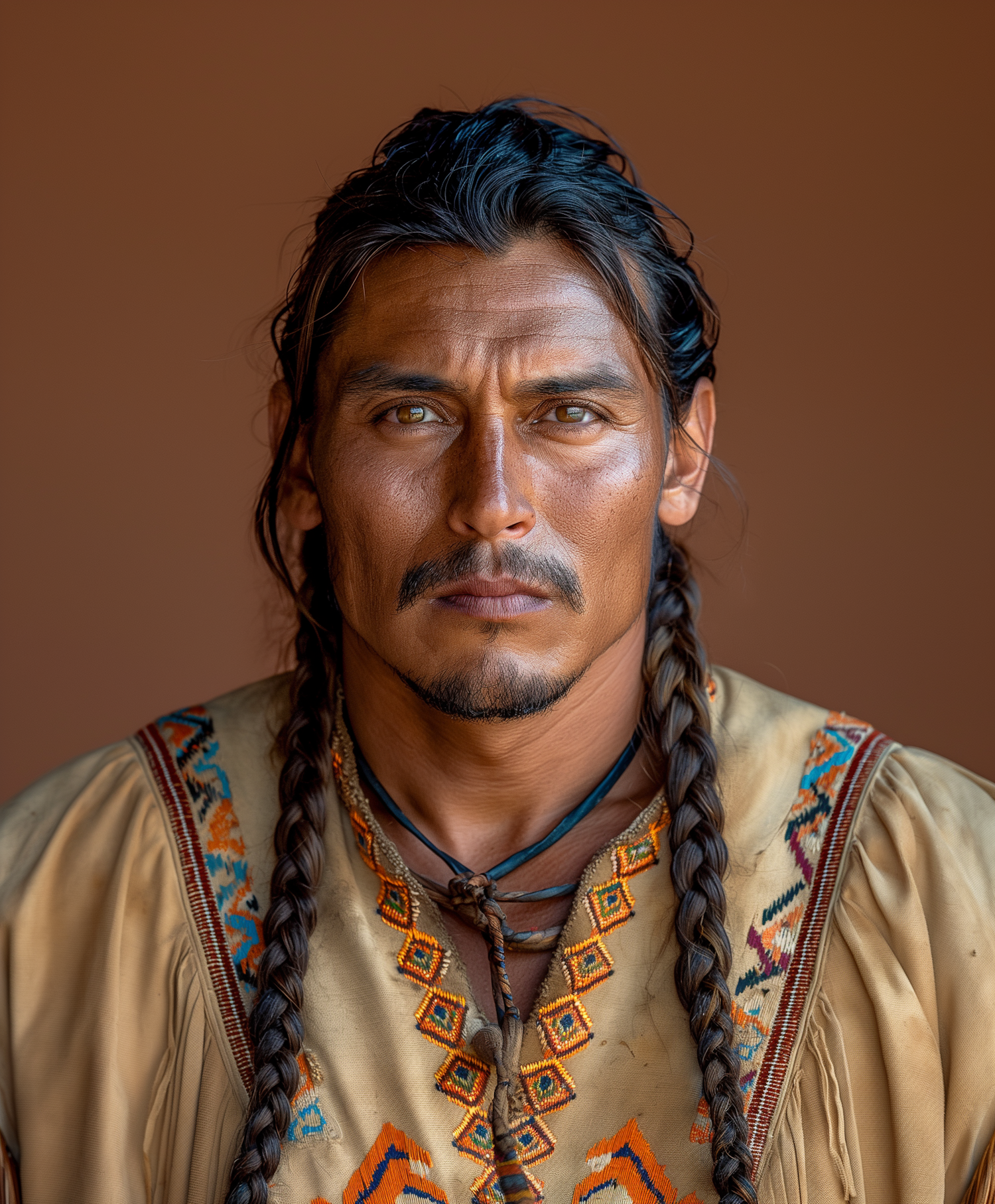 Man with braided hair in traditional attire, featuring geometric patterns, against a brown background. Intense gaze and serious expression.