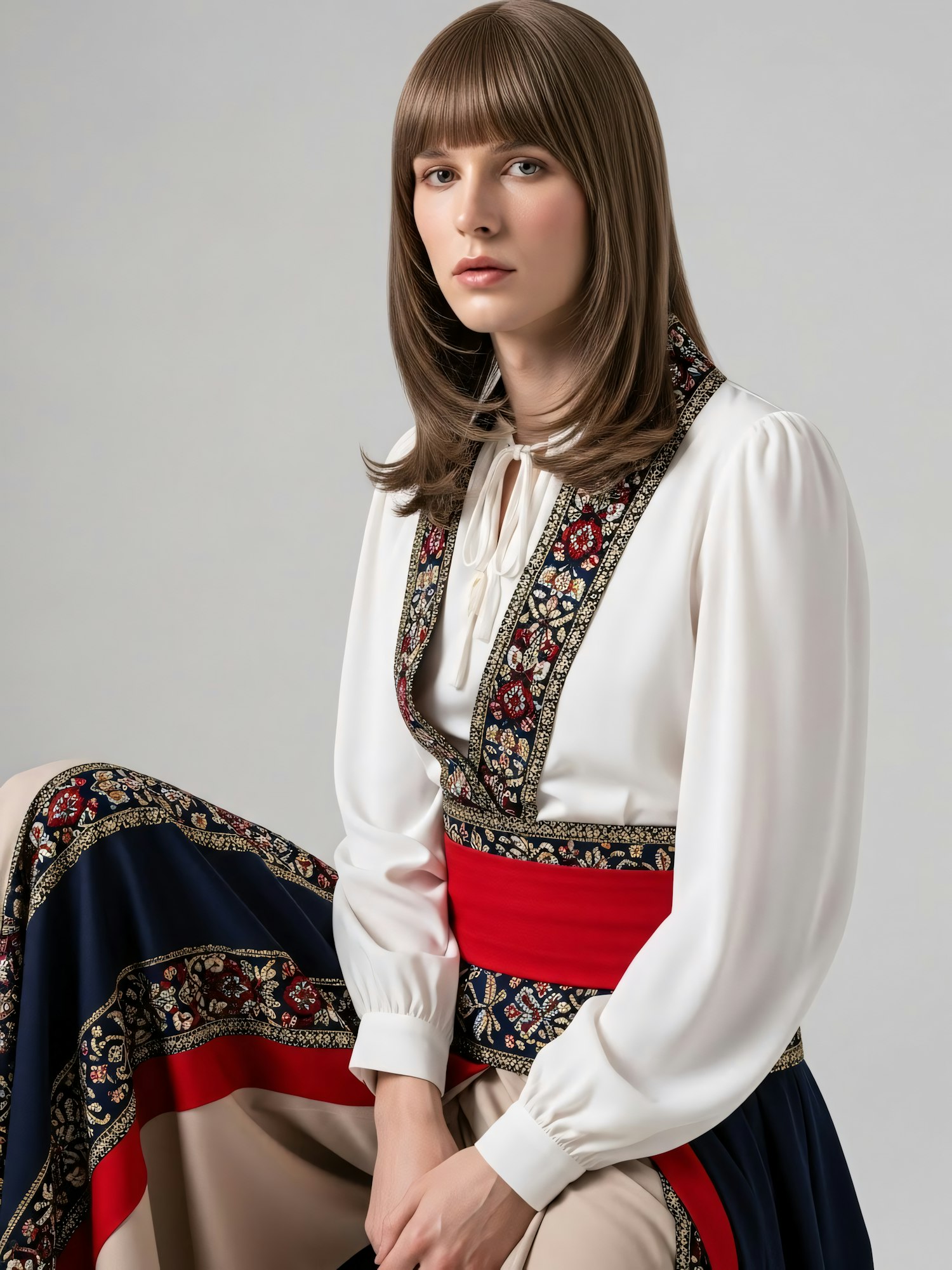 A person in traditional attire with intricate embroidery and a red sash, seated against a neutral background, exuding elegance.