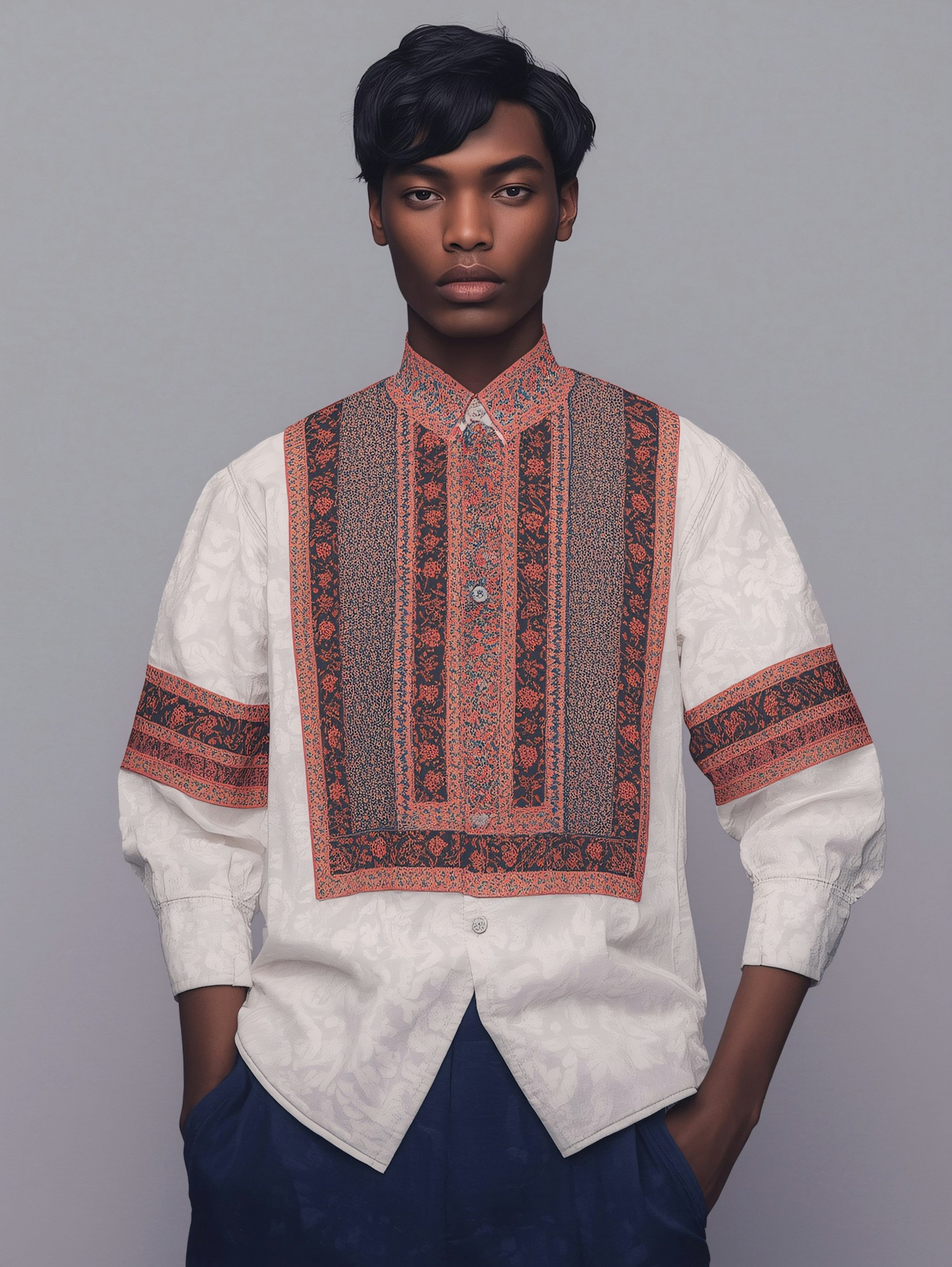 Stylish individual in a patterned white shirt with red and black accents, paired with dark blue pants, against a neutral gray background.